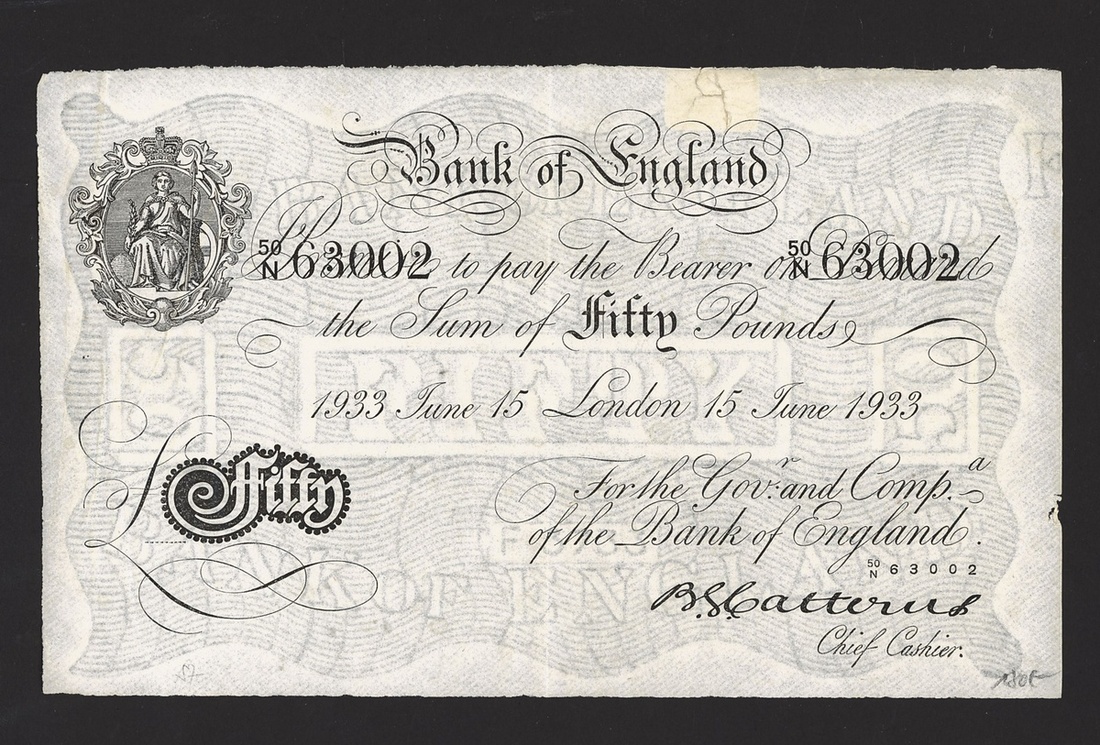 Bank of England, K. O. Peppiatt, Operation Bernhard, £50, 1933, serial number 50N 63002, (EPM B244*), split at upper margin, otherwise about extremely fine