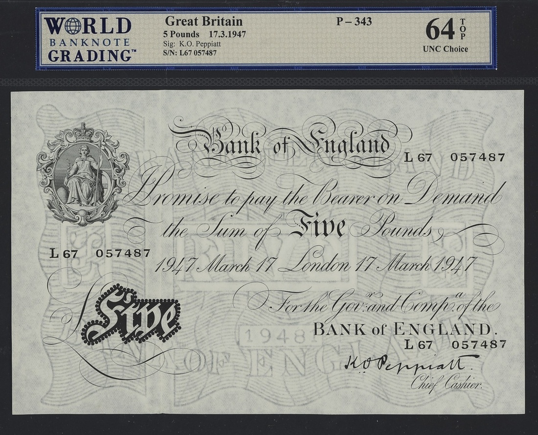 (x) Bank of England, K. O. Peppiatt, £5, 1947, serial number L67 057487, (EPM B264, Pick 343), in WBG holder 64 TOP UNC Choice