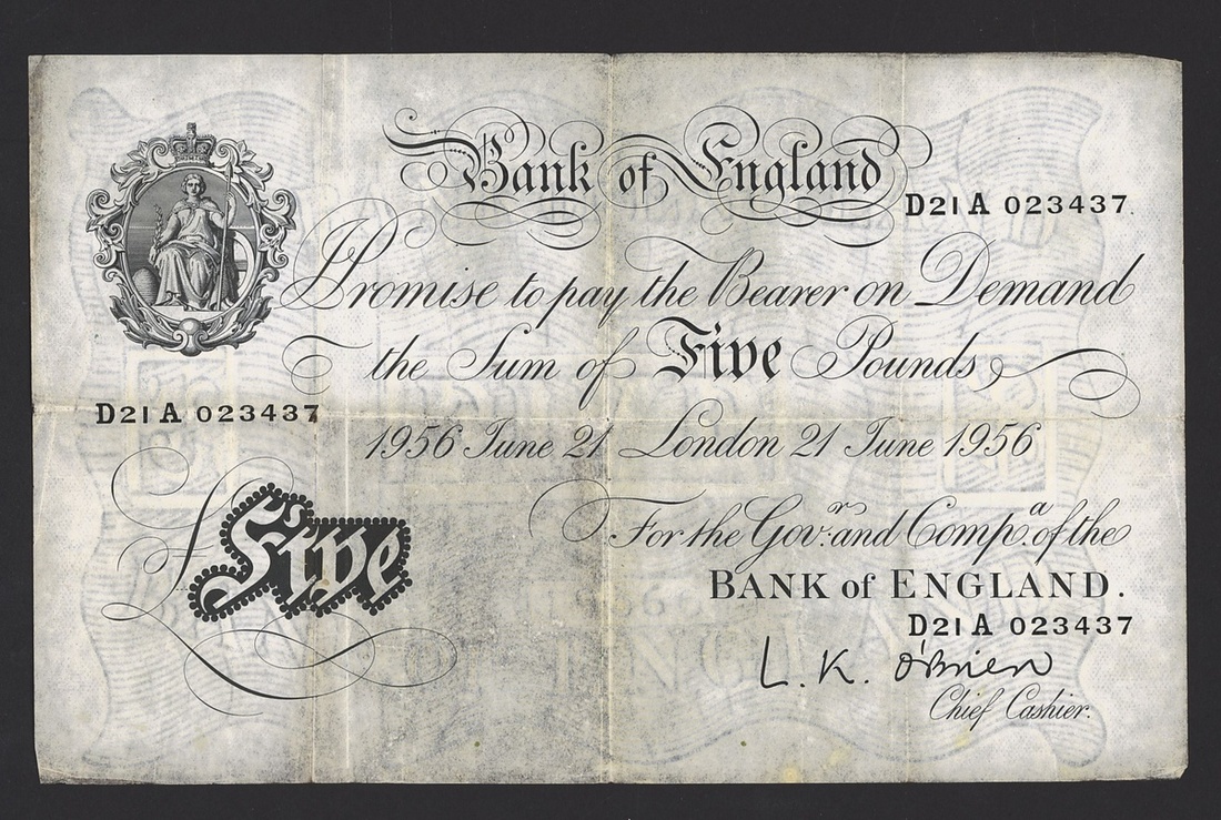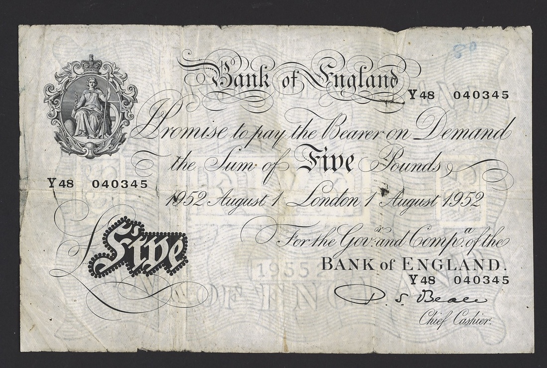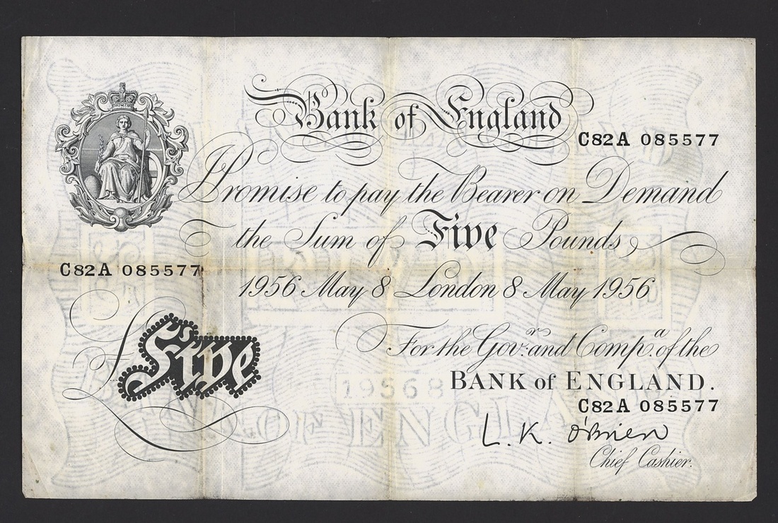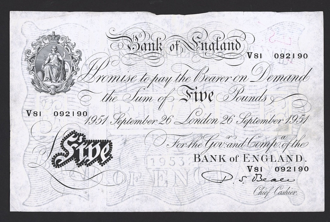 A group of Beale/O'Brien white notes, including Beale £5 (2), 1951-52, prefix V81, Y48, O'Brien £5 (2) 1956, prefix C82A, D21A,