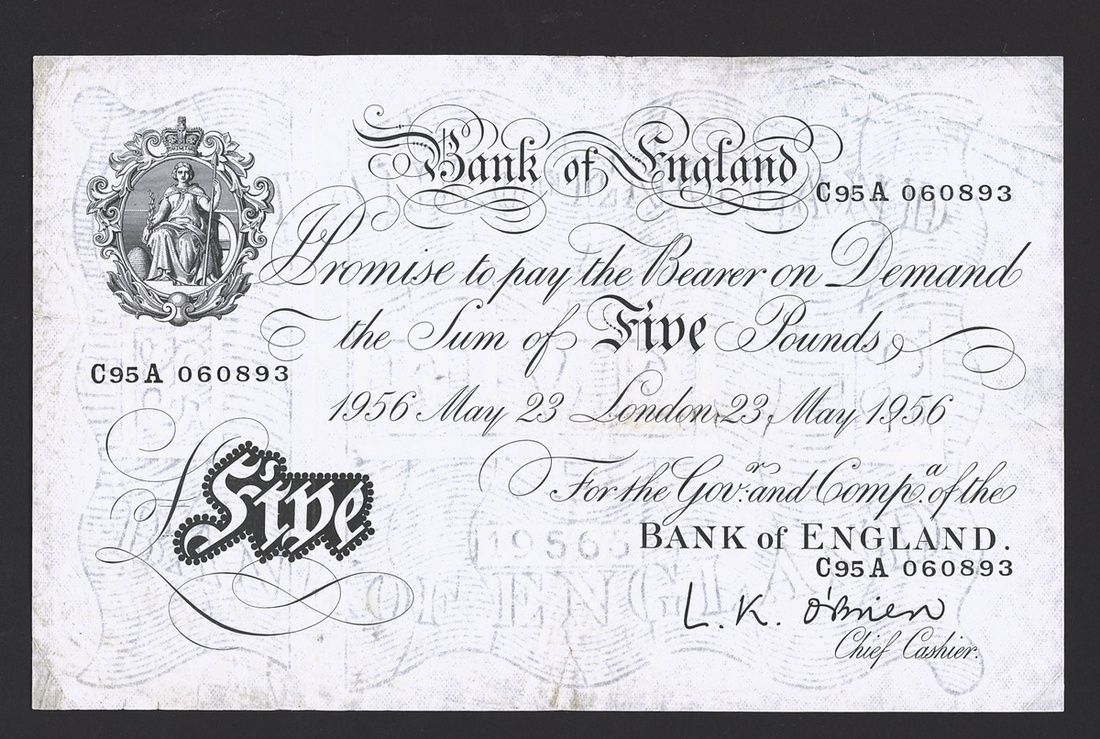 Bank of England, L.K. O'Brien, £5, London, 23 May 1956, serial number C95A 060893, (EPM B276), minor stain at reverse, very fine