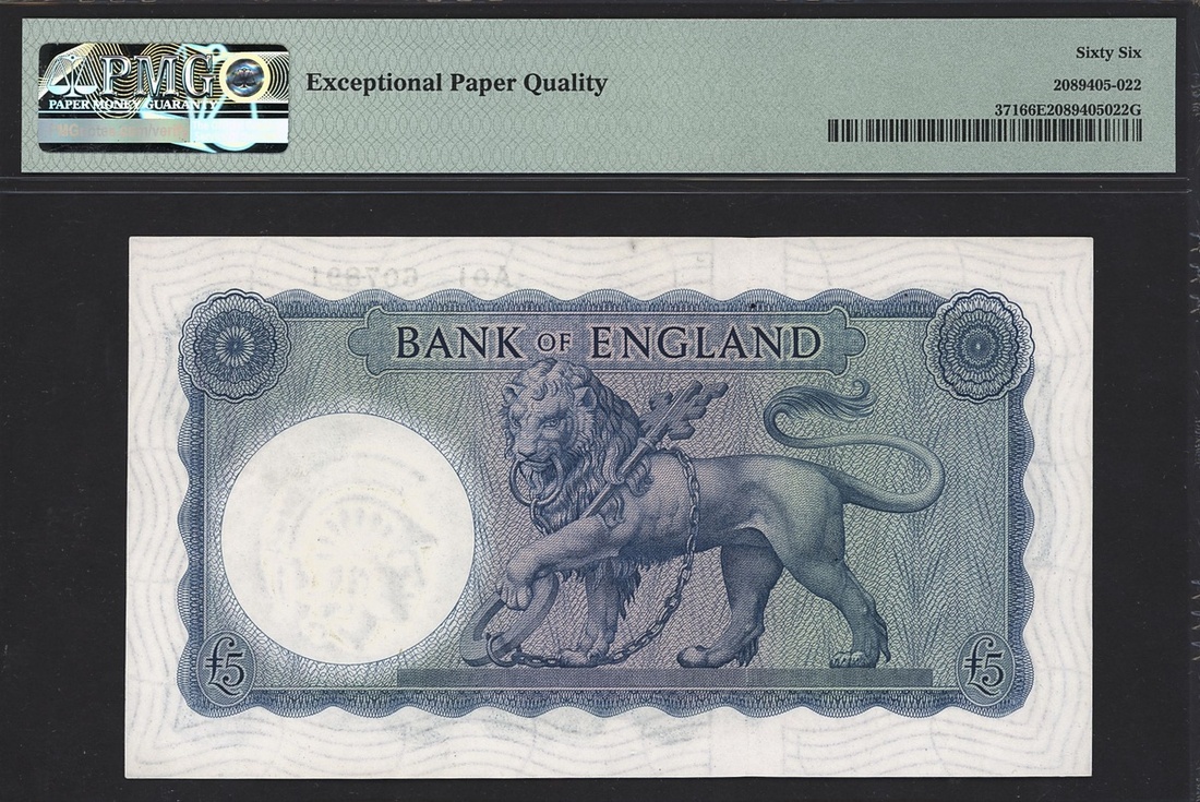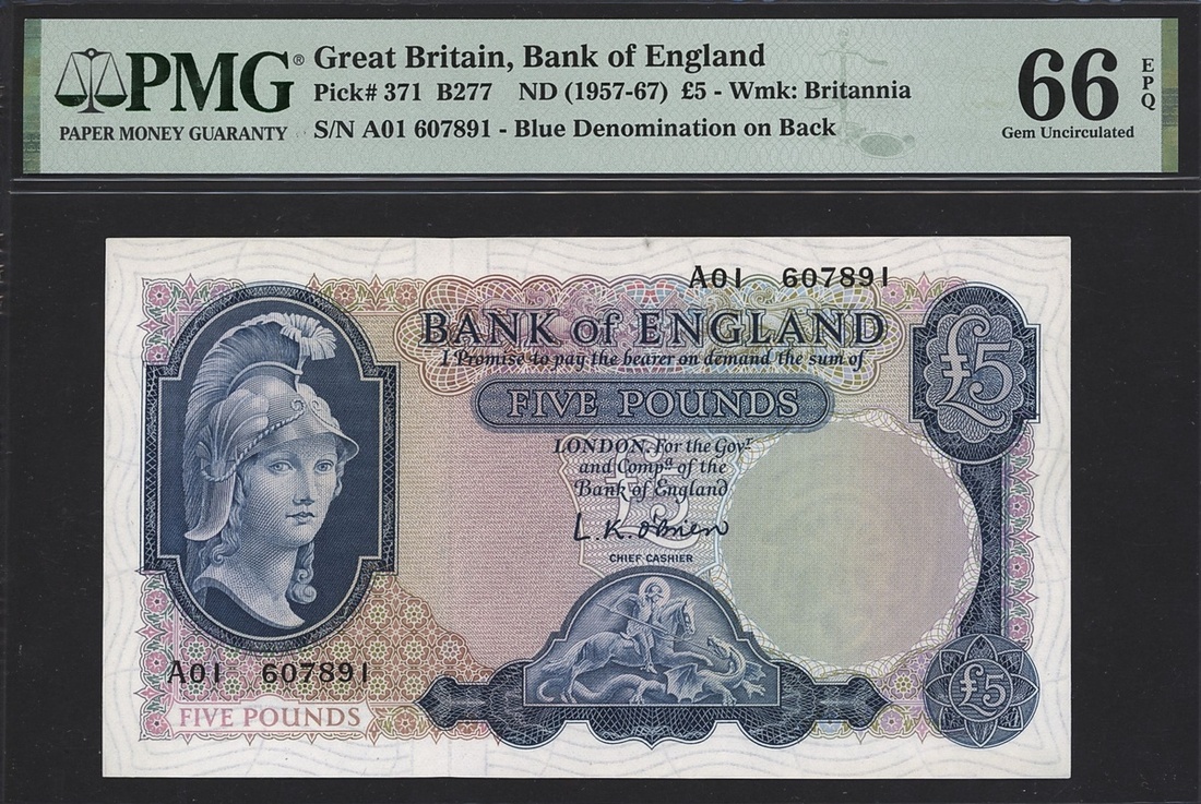 (x) Bank of England, O'Brien £5, ND (1957-67), serial number A01 607891, (EPM B277, Pick 371), in PMG holder 66 EPQ Gem Uncirculated. A scarce A01 first prefix