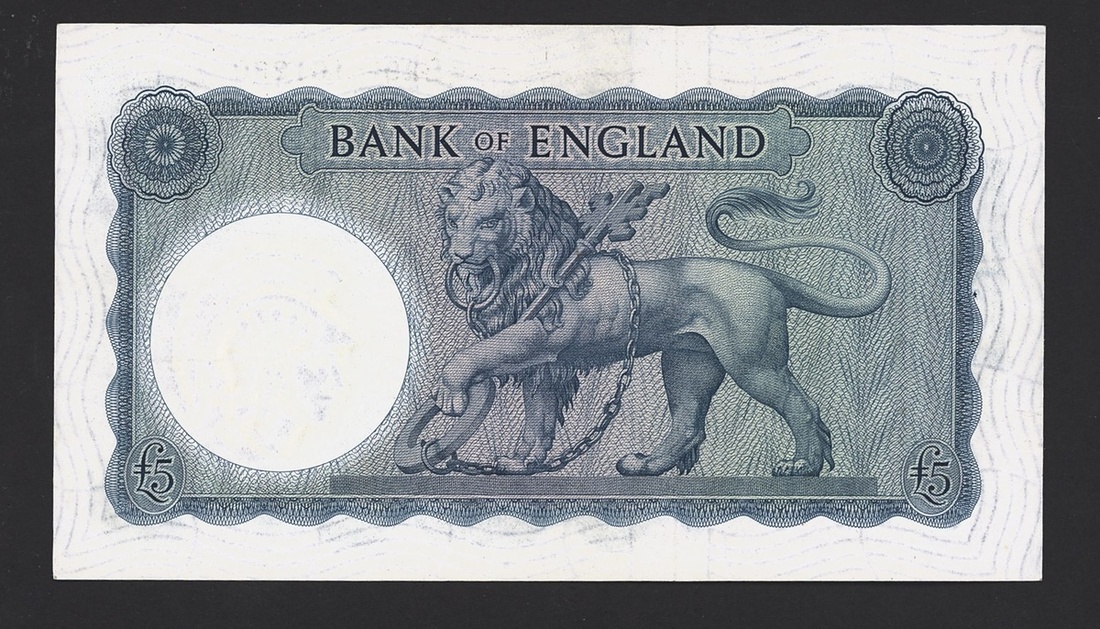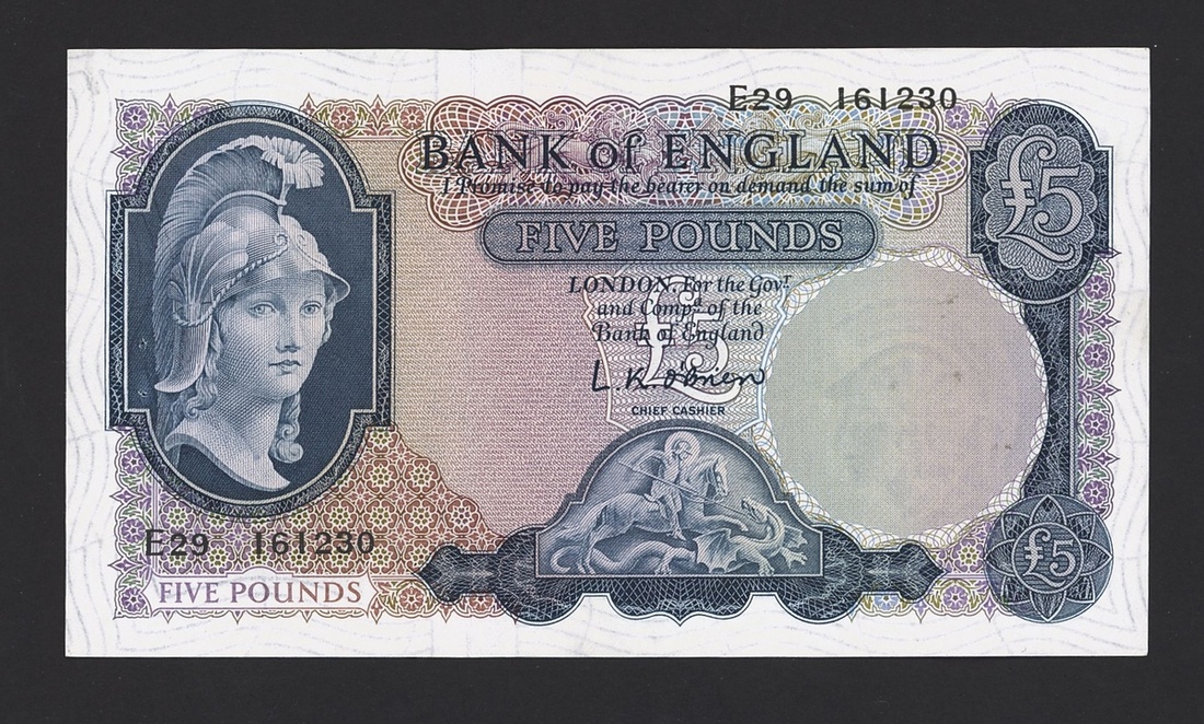 Bank of England, L.K. O'Brien, £5, ND (1957), serial number E29 161230, (EPM B277), staple holes at left, otherwise uncirculated, last run E37