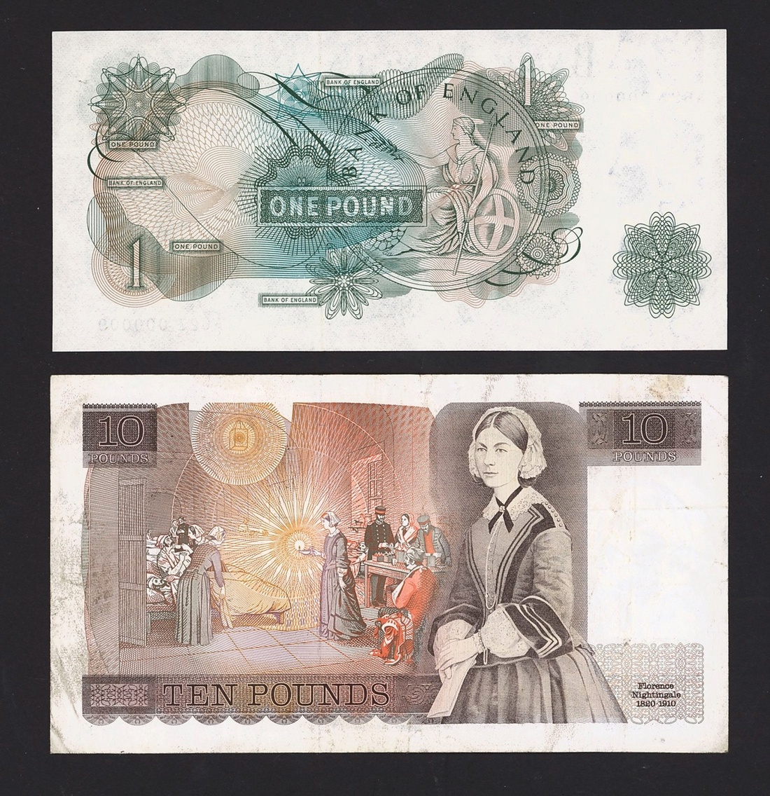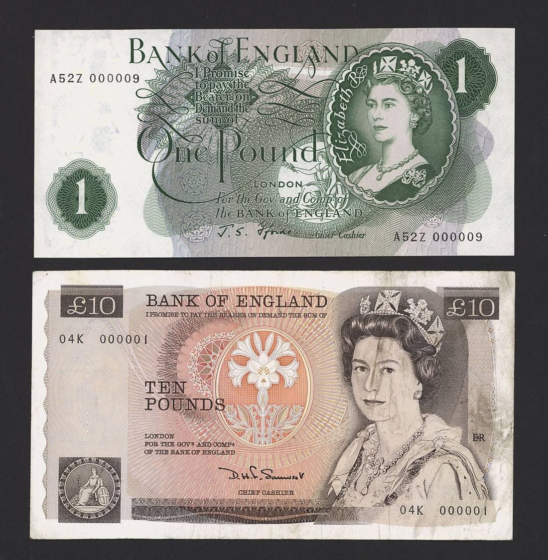 Bank of England, £1, 1967, serial number A52Z 000009, Also £10, 1980, serial number 04K 000001.