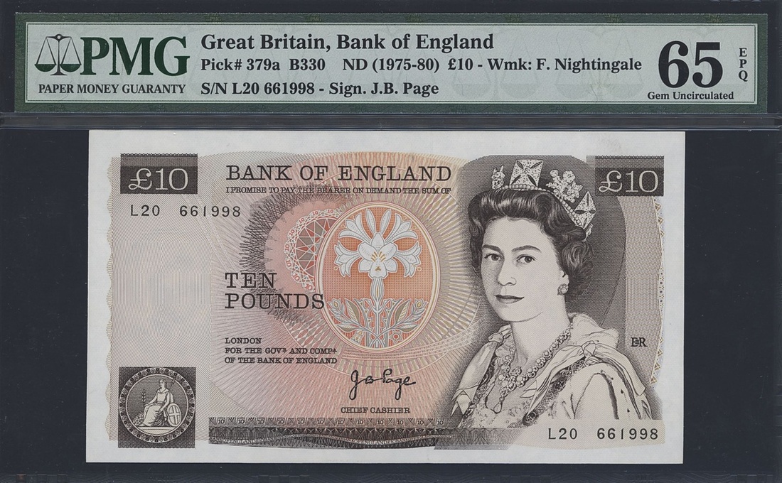 (x) Bank of England, £10, ND (1975-80), serial number L20 661998, (EPM B330, Pick 379a), in PMG holder 65 EPQ Gem Uncirculated