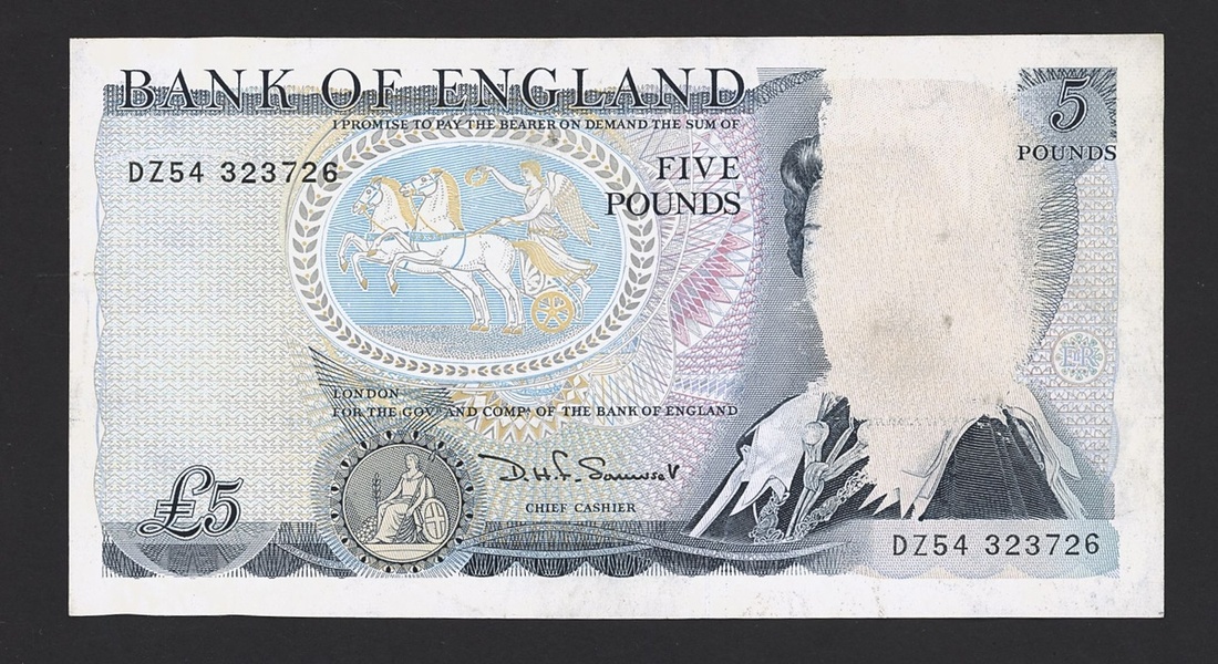 Bank of England, D.H.F. Somerset, ERROR £5, ND (1980), serial number DZ54 323726, (EPM B343), queen's head largely missing from obstruction during printing process, good very fine, interesting error