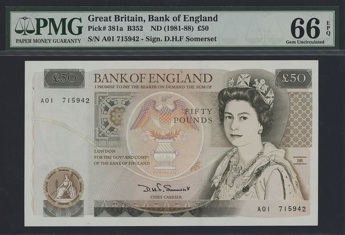 (x) Bank of England, £50, ND (1981-88), serial number A01 715942, (EPM B352, Pick 381a), in PMG holder 66 EPQ Gem Uncirculated