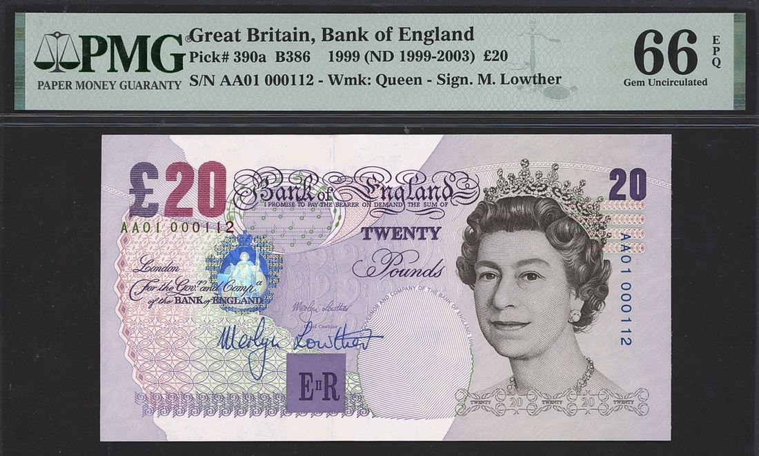 Bank of England, Great Britain, Signed M. Lowther, 20 pounds, 1999 (ND 1999-2003), serial number AA01 000112, Low serial number.