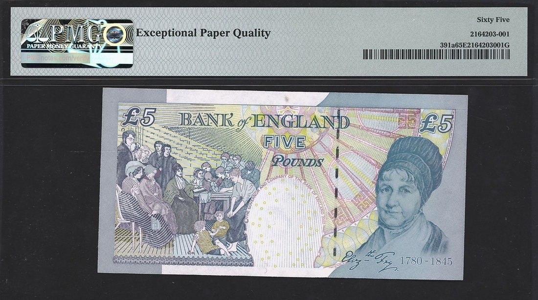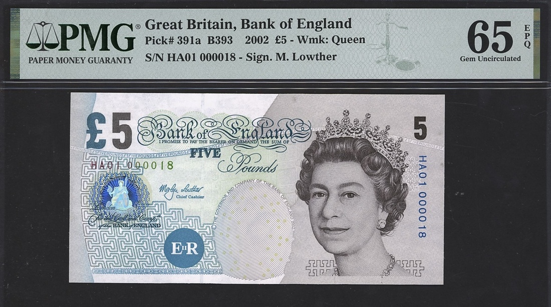 Bank of England, M. Lowther, £5, ND (2002), serial number HA01 000018, (EPM B393, Pick 391a), in PMG holder 65 EPQ Gem Uncirculated, first run low number, ex Bank of England Charity Auction (Jan 2003), lot 12, scarce