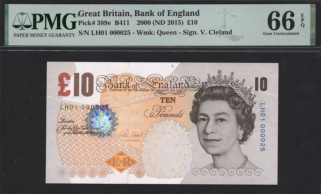 Bank of England, Great Britain, 10 pounds, 2000 (ND 2015), serial number LH01 000025, Low serial number.