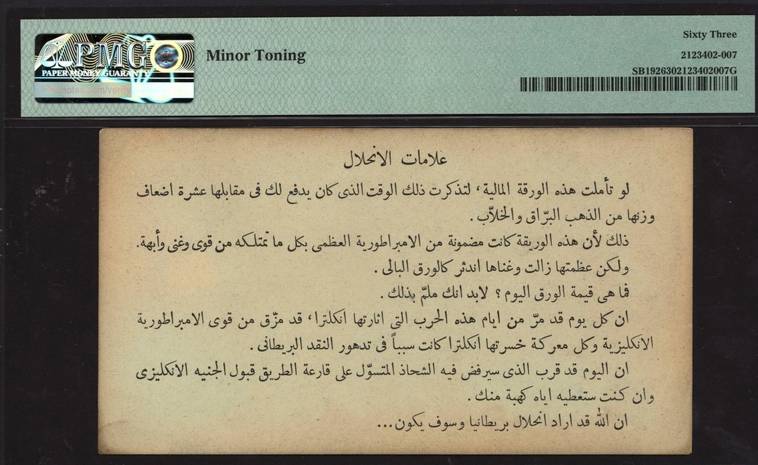 Bank of England, axis propaganda note done in the style of a Peppiatt £1, done by Germany during the Second World War and dropped over North Africa, Arabic writing on reverse with statements about the decline of the British,