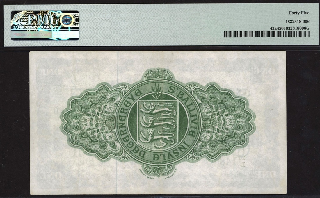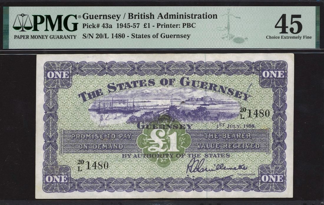 (x) States of Guernsey, £1, 1958, serial number 20L 1480, (Pick 43a, TBB B148o), in PMG holder 45 Choice Extremely Fine, only 2 notes in higher grade on PMG Census