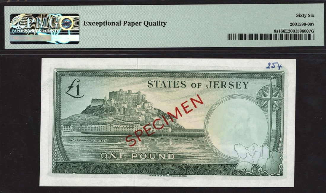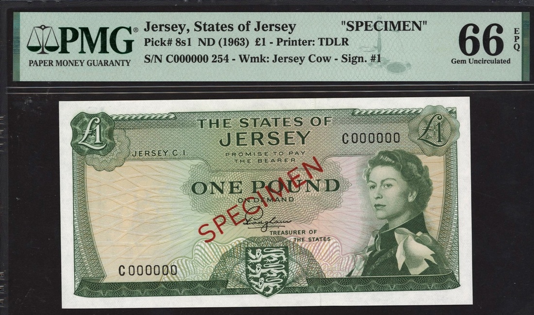 (x) States of Jersey, specimen £1, ND (1963), serial number C000000, (Pick 8s1, BNB 108as1), in PMG holder 66 EPQ Gem Uncirculated. Ink annotation at reverse