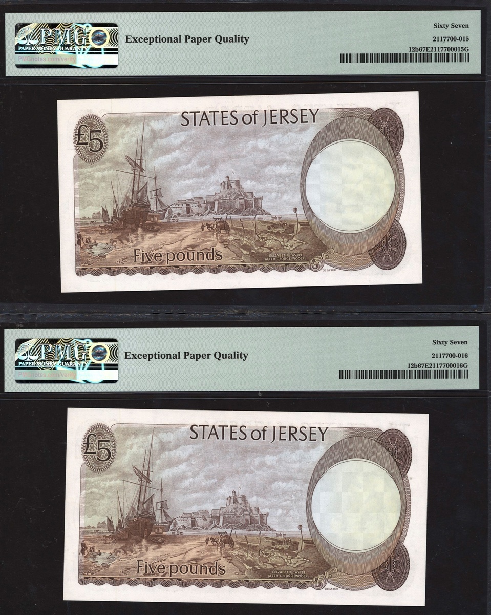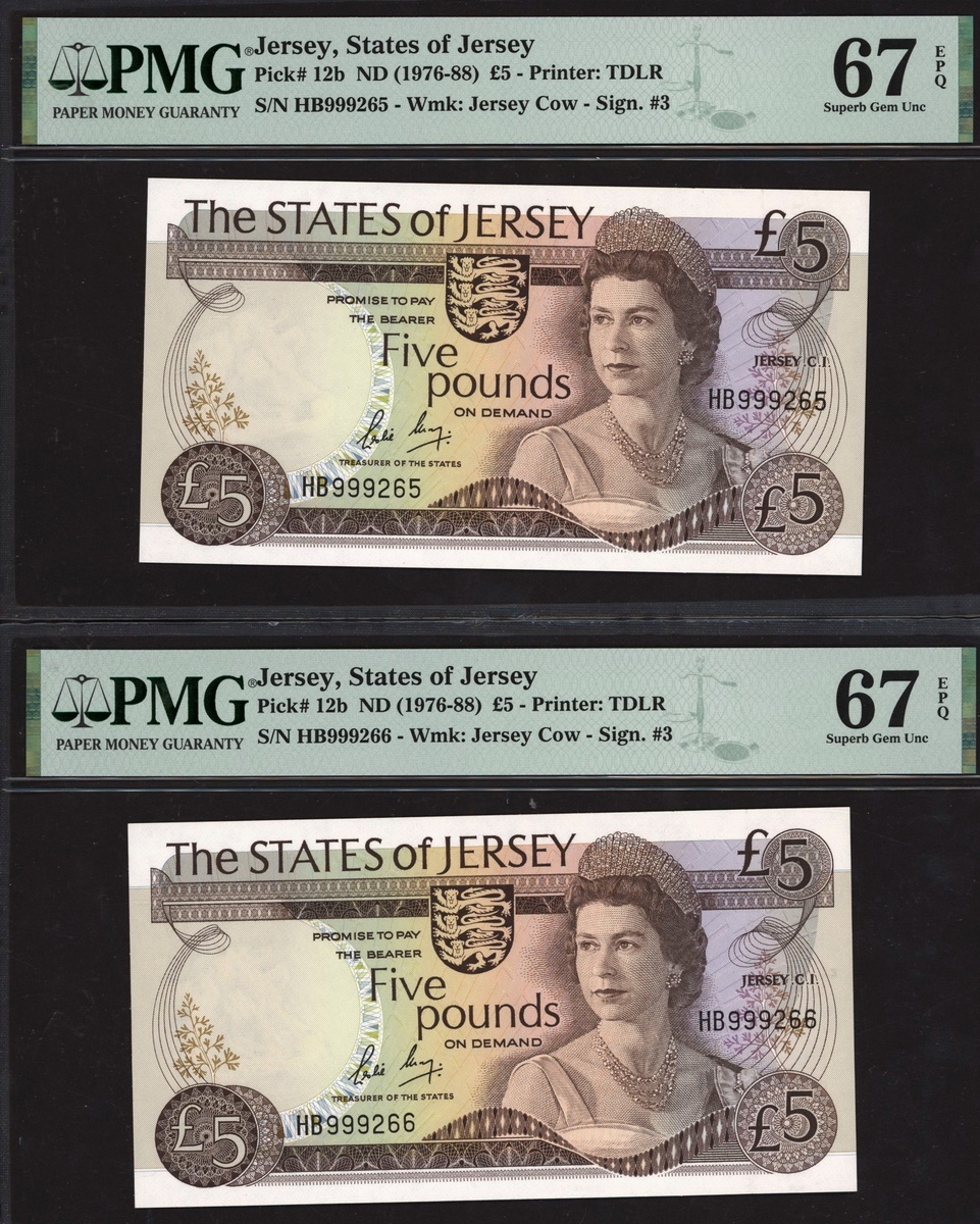 (x) States of Jersey, consecutive pair £5, ND (1967-88), serial numbers HB999265/66, (Pick 12b, BNB 112b), both in PMG holders 67 EPQ Superb Gem Unc. Only 3 examples in a higher grade (2 notes)