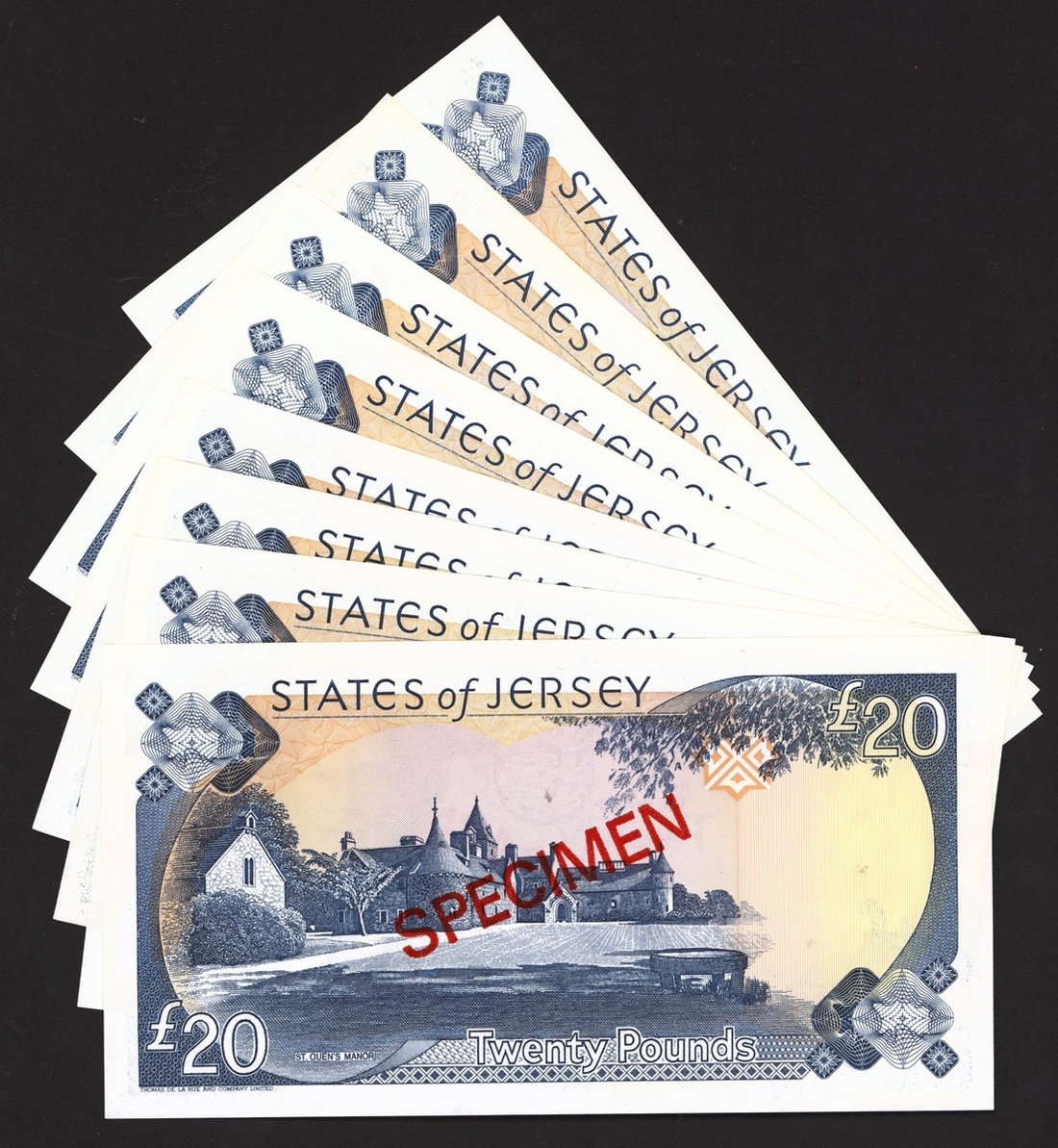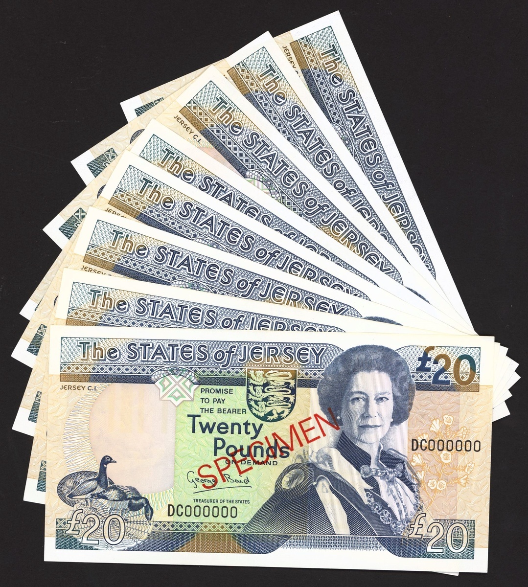 States of Jersey, a group of specimen £20, ND (1993-2000), various prefixes DC, EC, GC, JC, MC, NC, PC, QC, baird or black signature,