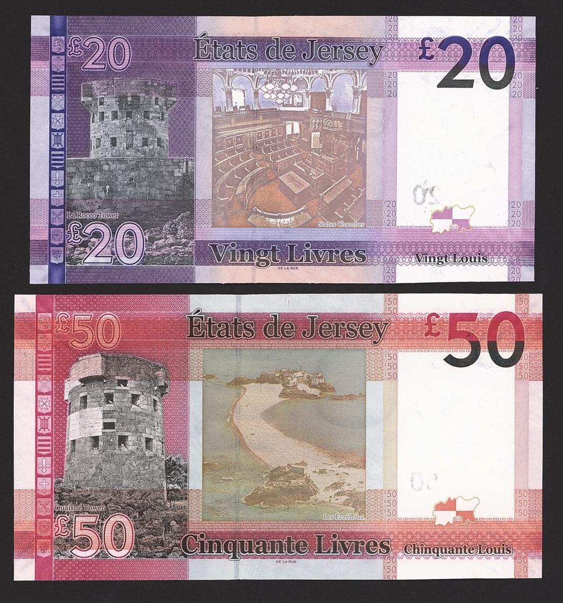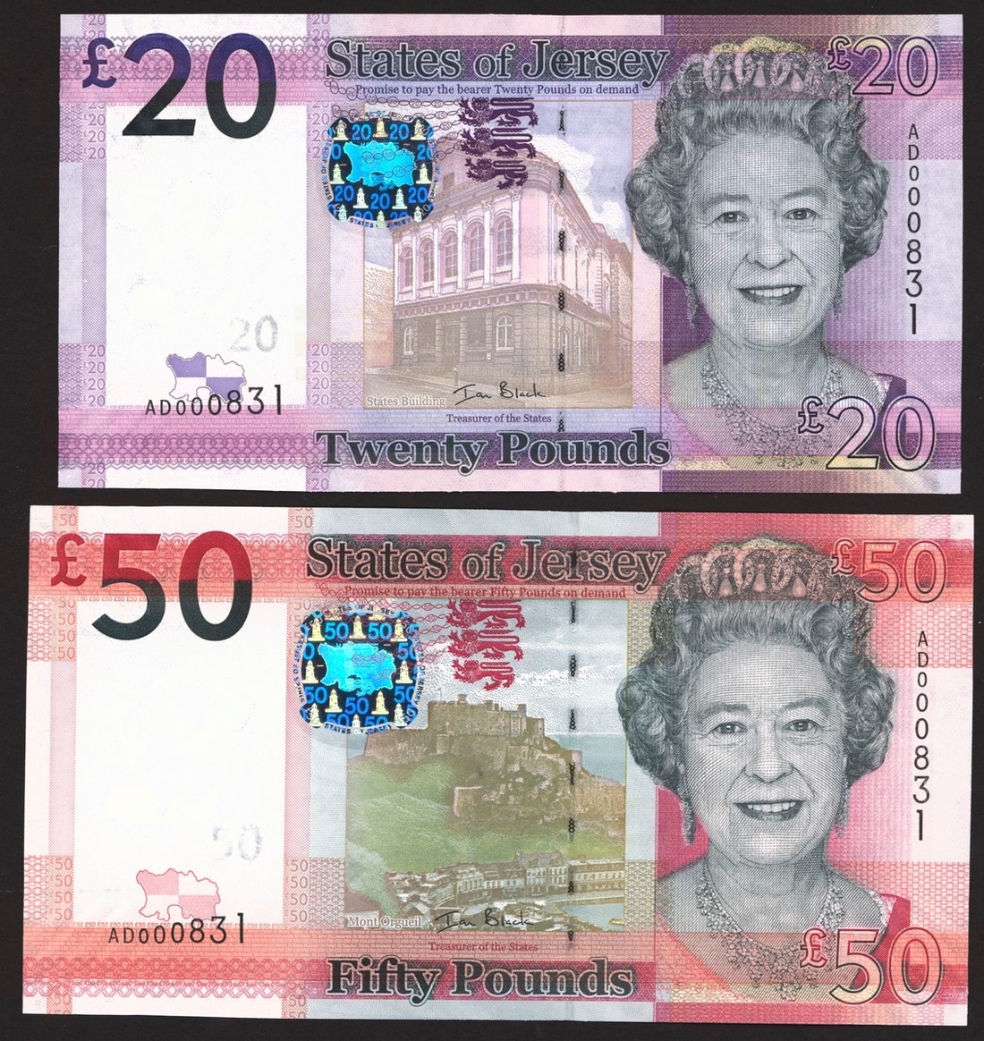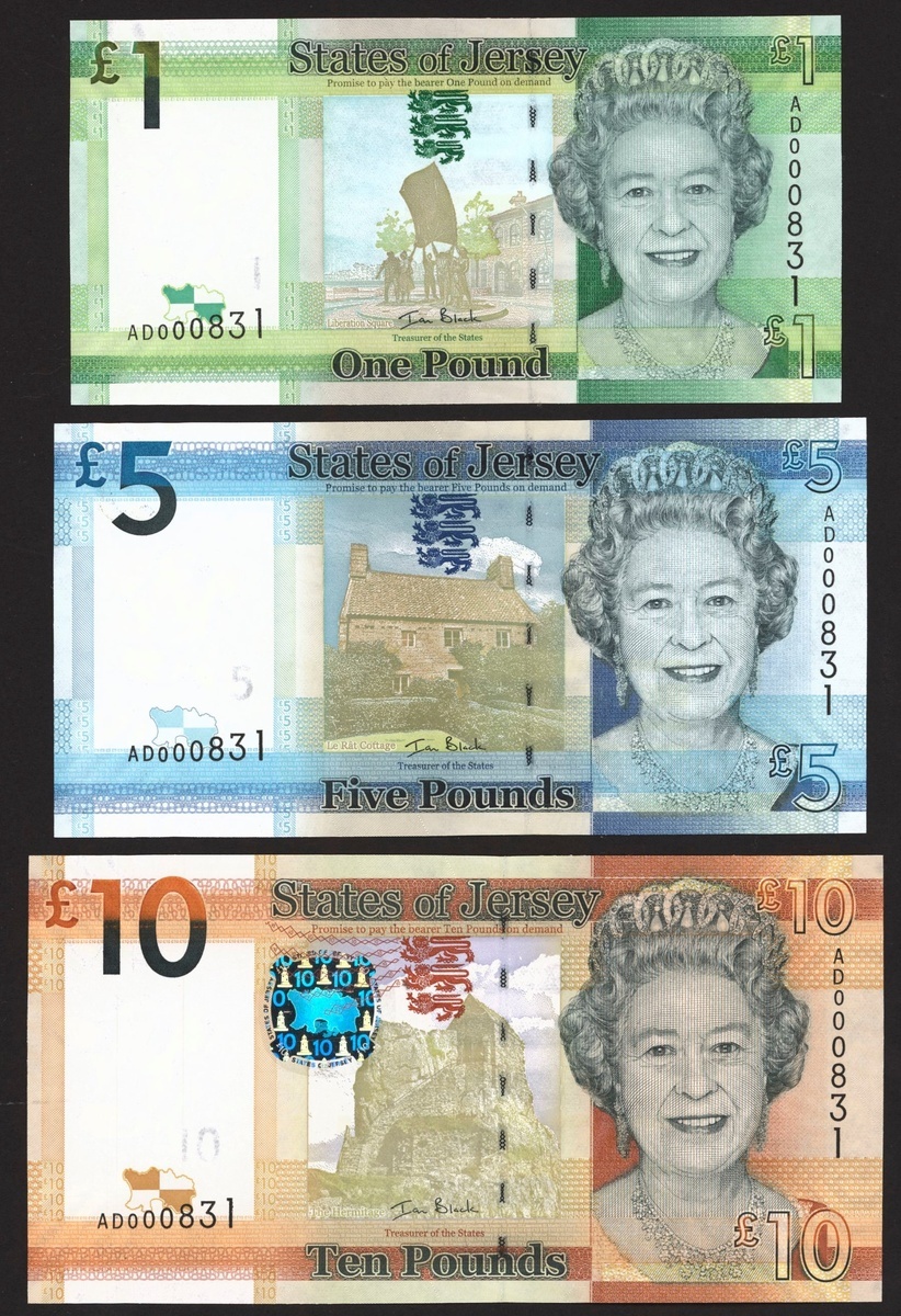 (x) States of Jersey, a matching serial number AD000831 set, including £1, £5, £10, £20 and £50, signature Black,