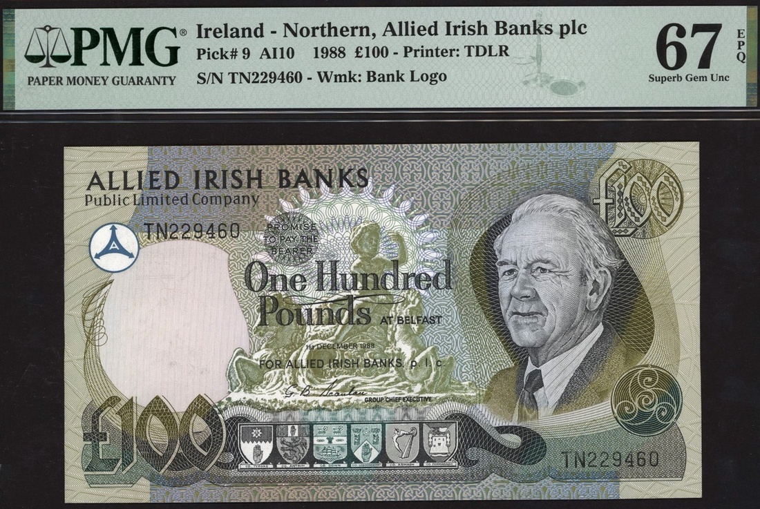 (x) Allied Irish Banks Limited, Northern Ireland, [Top Pop] £100, 1 January 1988, serial number TN229460, (PMI AI10, Pick 9), in PMG holder 67 EPQ Superb Gem Unc