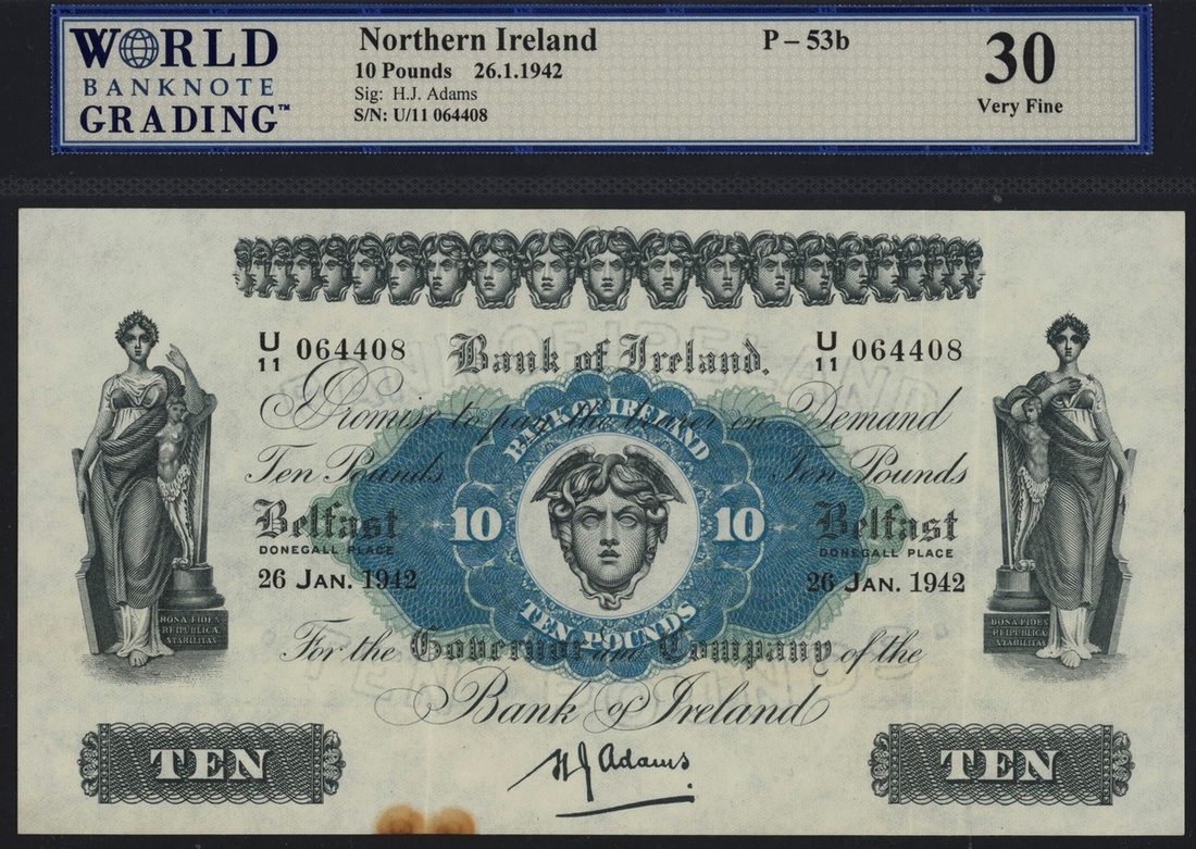 (x) Bank of Ireland, Northern Ireland, 10 pounds, 1942, serial number U11 064408, (PMI BA102, Pick 53b), in WBG holder 30 Very Fine