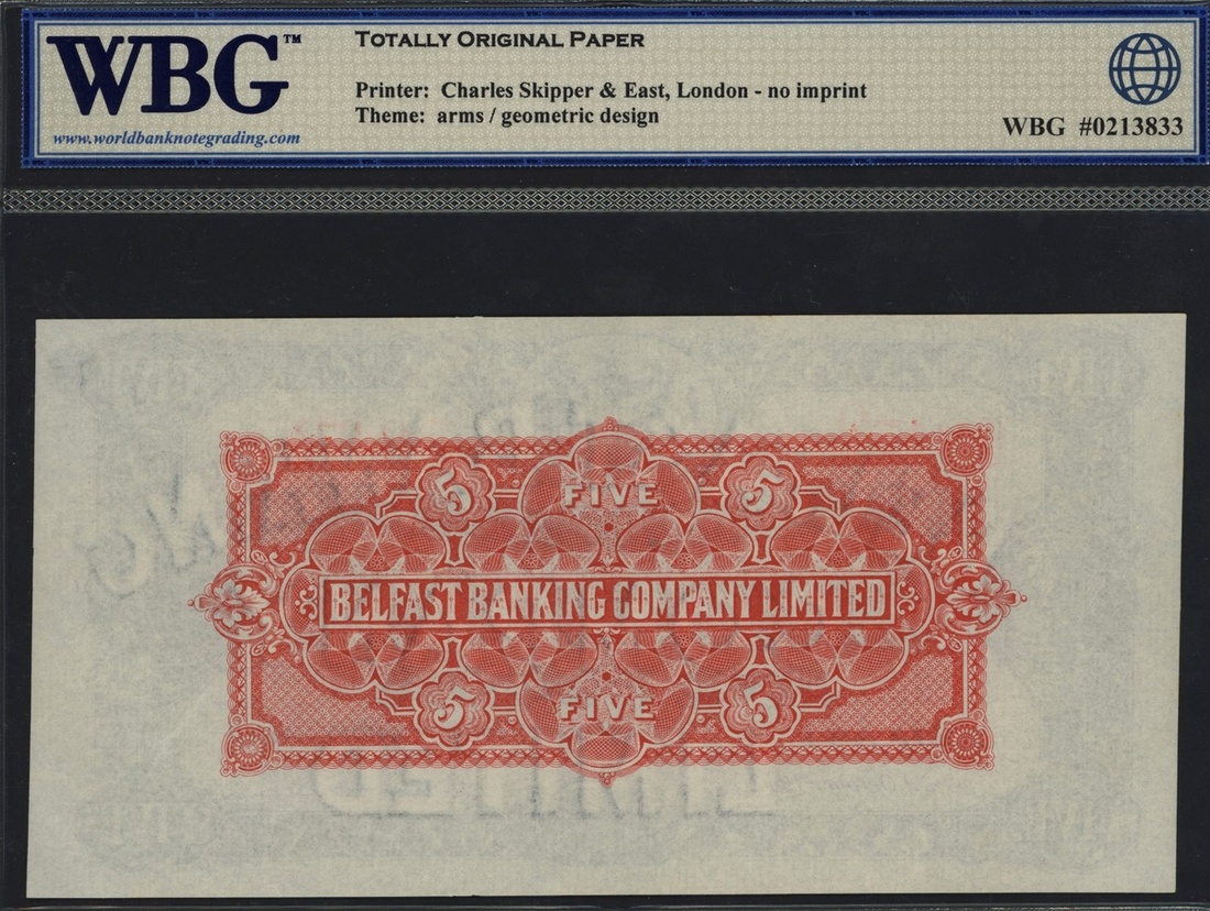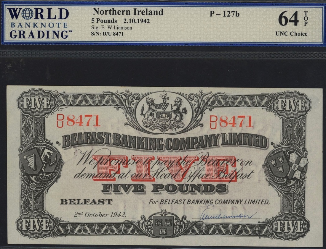 (x) Belfast Banking Company Limited, Northern Ireland, 5 pound, 1942, serial number D/U 8471, (PMI BB69, Pick 127b), in WBG holder 64 TOP UNC Choice