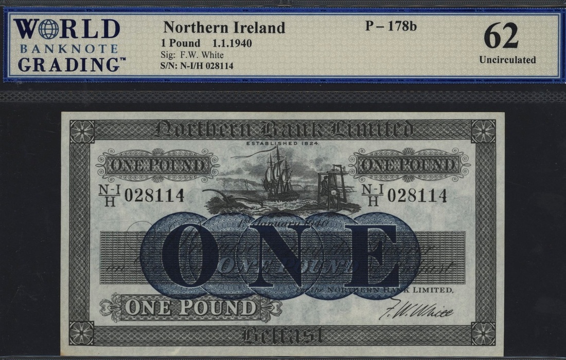 (x) Northern Bank Limited, Northern Ireland, 1 pound, 1940, serial number N-1/H 028114, (PMI NR68, Pick 178b), in WBG holder 62 Uncirculated