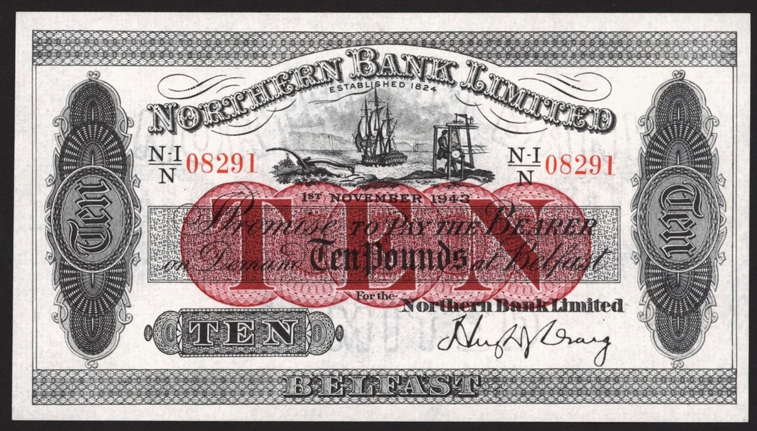 (x) Northern Bank Limited, Ireland, £10, 1 November 1943, serial number N-I/N 08291, (PMI NR80, Pick 181c), uncirculated