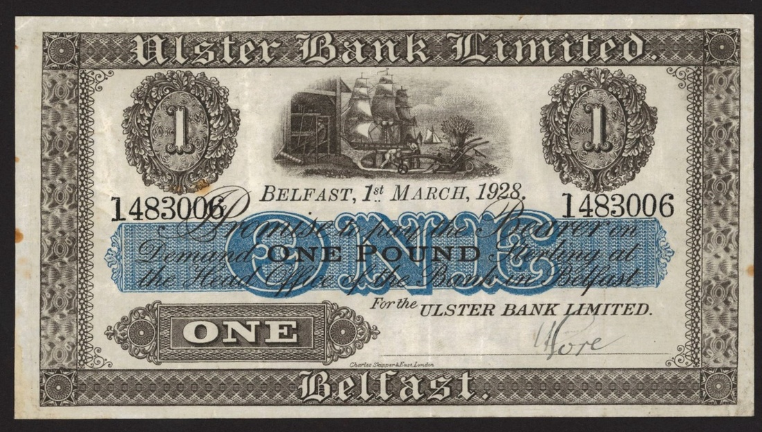 (x) Ulster Bank, Northern Ireland, £1, 1 March 1928, serial number 1483006, (PMS UB40, Pick 388b), foxing at left, very fine, quite scarce