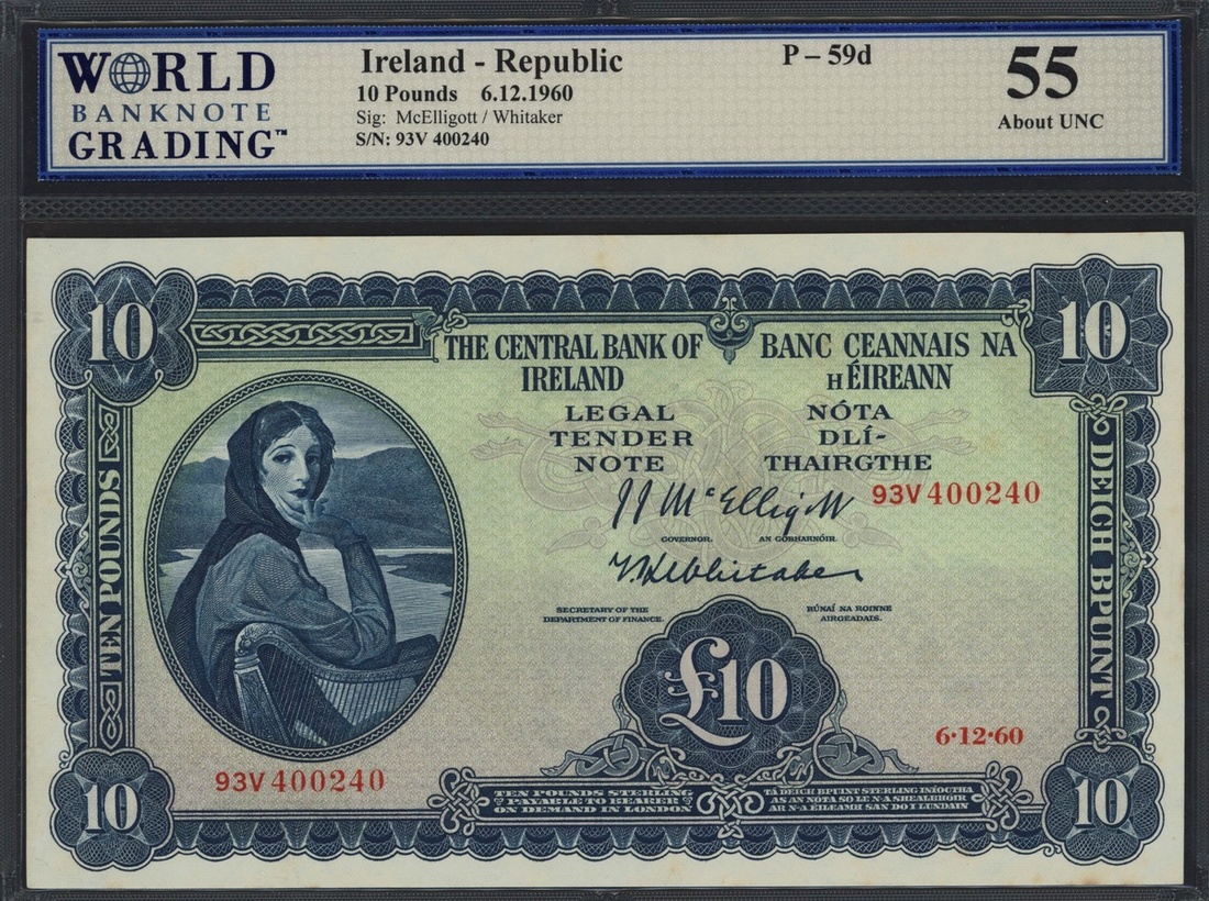 (x) The Central Bank of Ireland, 10 pounds, 1960, serial number 93V 400240, (PMI 43a, Pick 59d), in WBG holder 55 About UNC