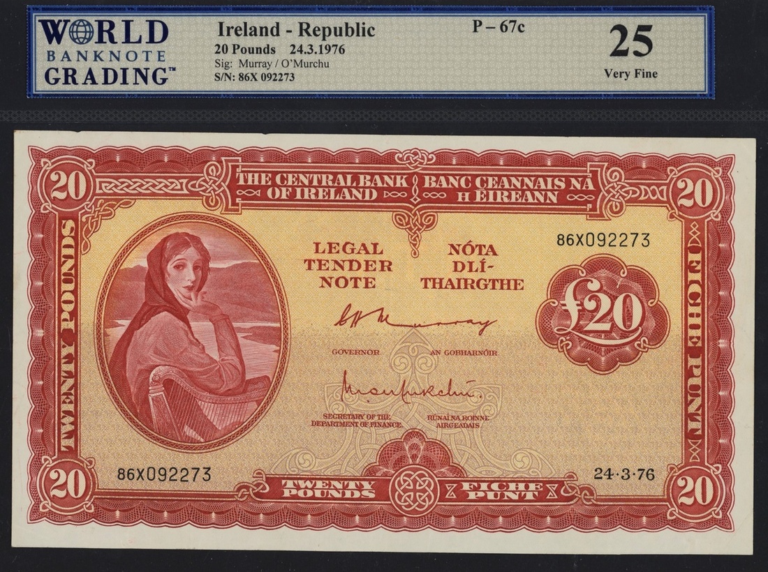 (x) The Central Bank of Ireland, 20 pounds, 1976, serial number 86X 092273, (PMI LTN 65, Pick 67c), in WBG holder 25 Very Fine