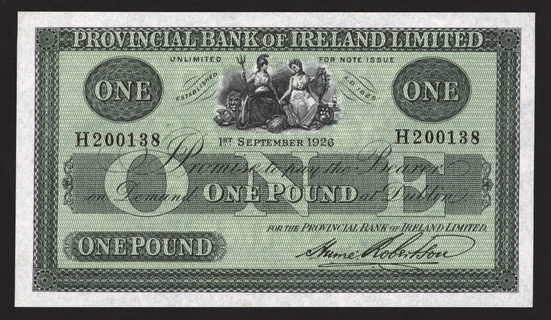 (x) Provincial Bank of Ireland, £1, 1 September 1926, serial number H200138, (PMS PR75, Pick 356r), two areas of repair where cancellation holes should be, otherwise crisp, uncirculated