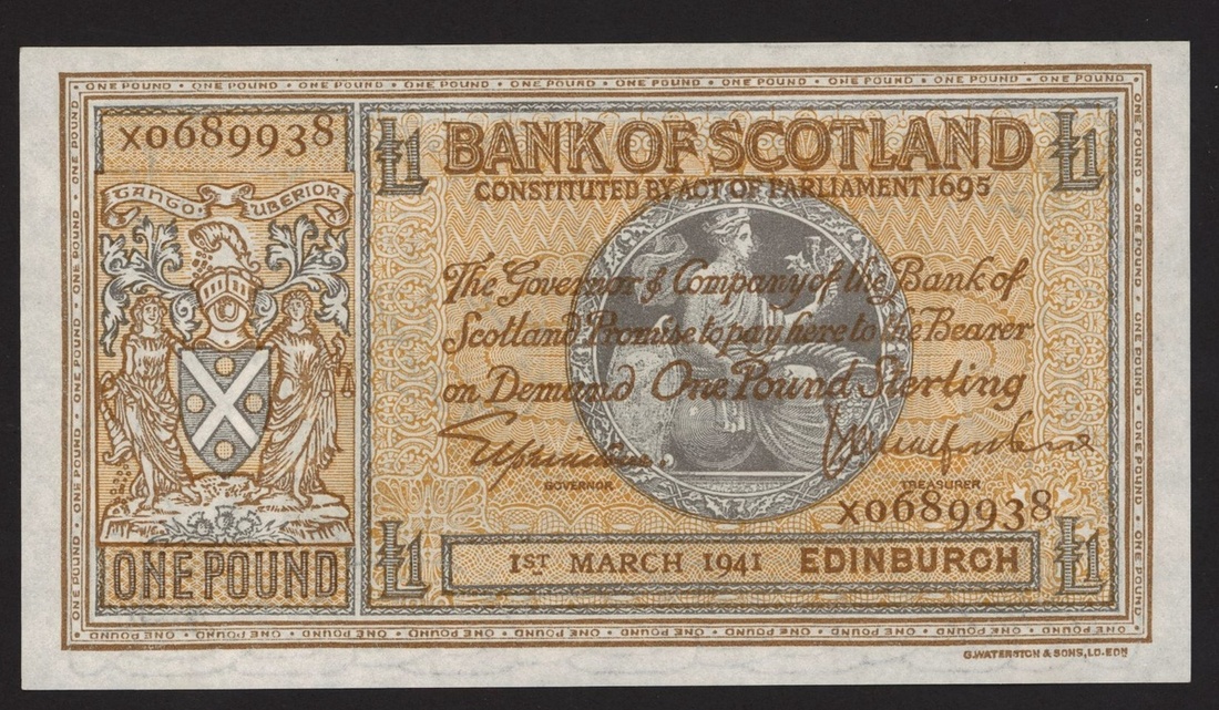 (x) Bank of Scotland, £1, 1 March 1941, serial number X0689938, (PMS BA95b), minor handling, about uncirculated