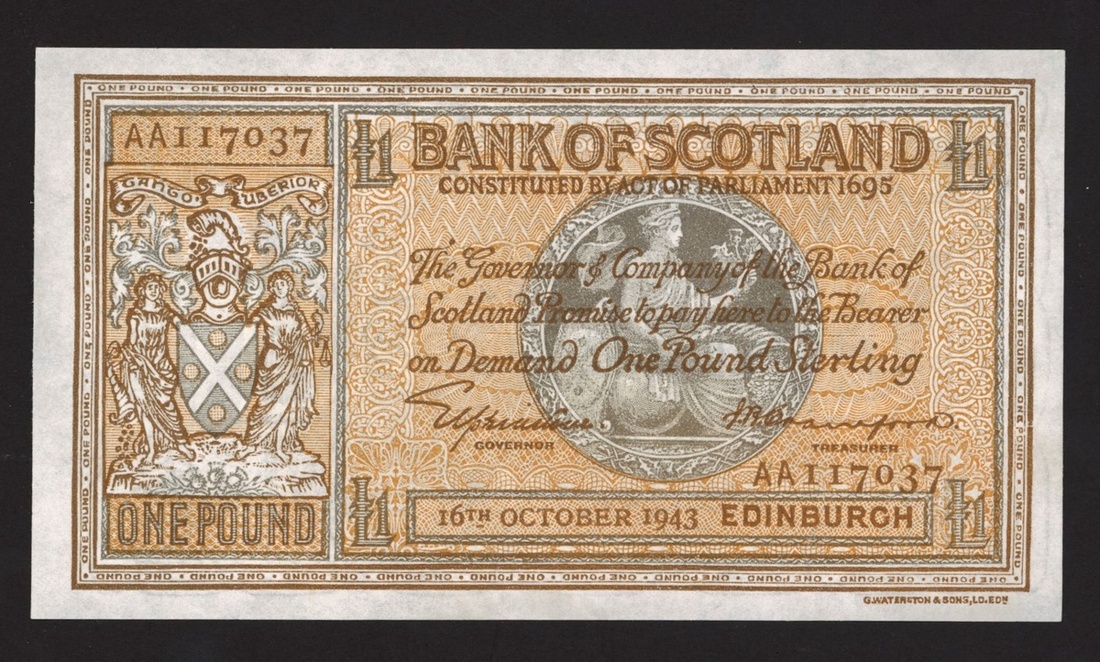 (x) Bank of Scotland, £1, 16 October 1943, serial number AA117037, (PMS BA95d), uncirculated