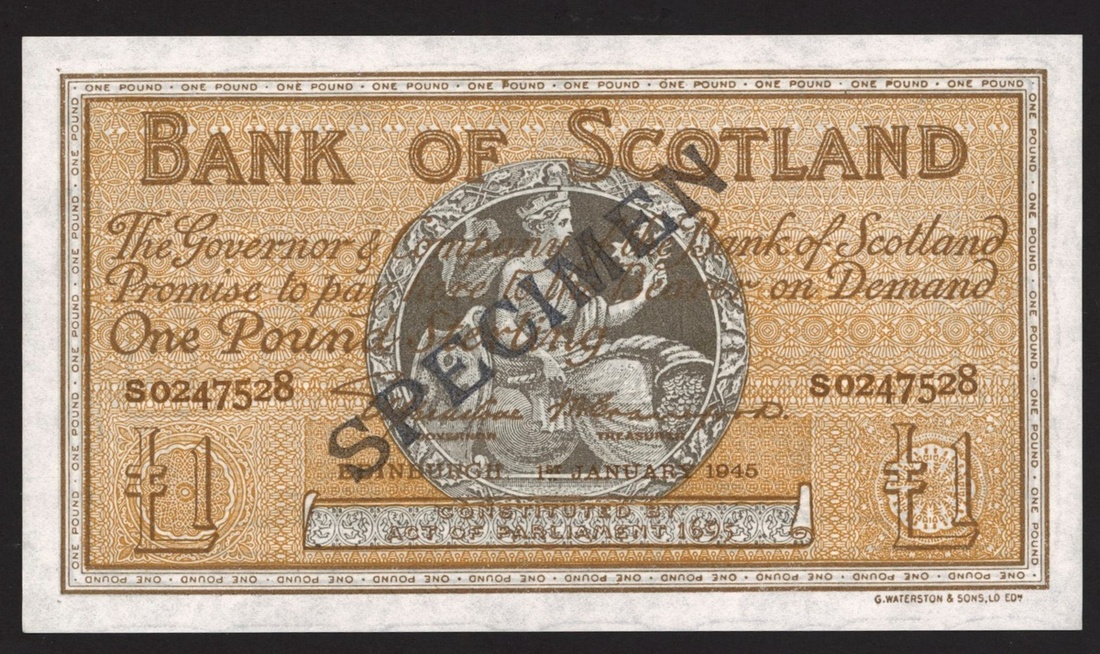 (x) Bank of Scotland, specimen trial £5, 1 January 1945, serial number S0247528, reverse dark grey,