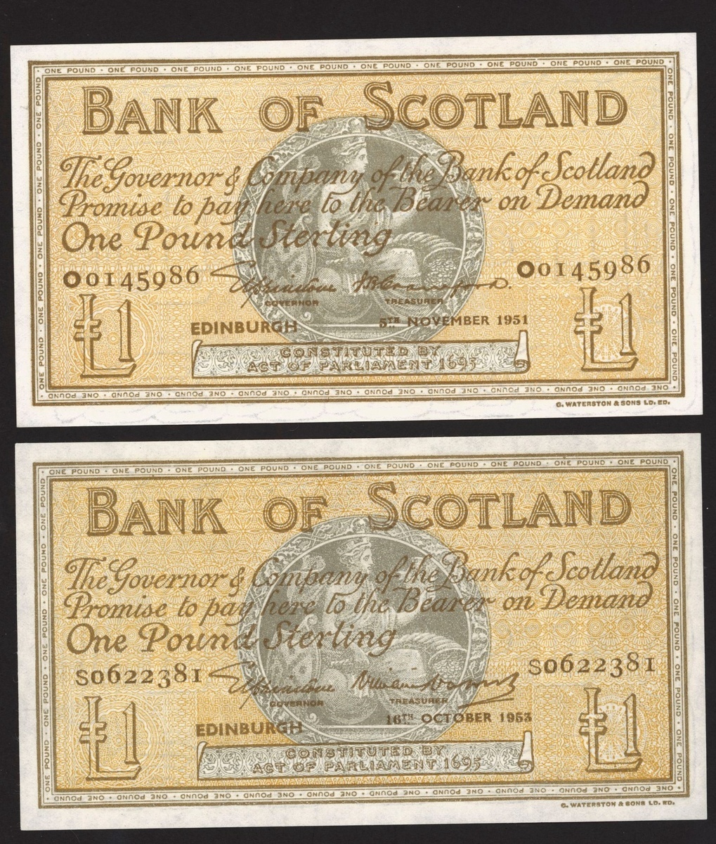 (x) Bank of Scotland, £1 (2), 1951, 1953, prefixes O and S, (PMS BA98b, c), uncirculated and lightly pressed extremely fine respectively (2 notes)