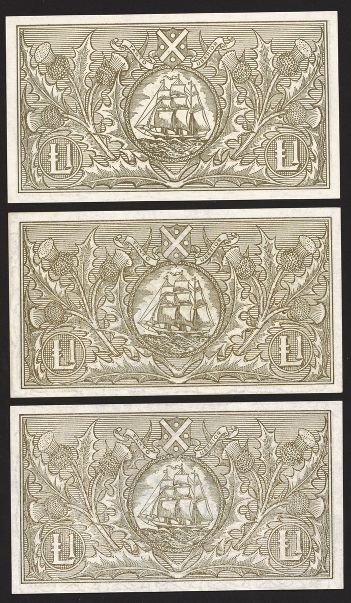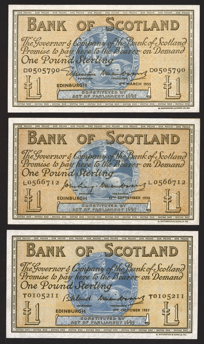 (x) Bank of Scotland, £1 (3), 1955, 1956, 1957, prefixes D, L, T, (PMS BA99a, b, c), 1956 £1 with a light crease, good extremely fine, others uncirculated (3 notes)
