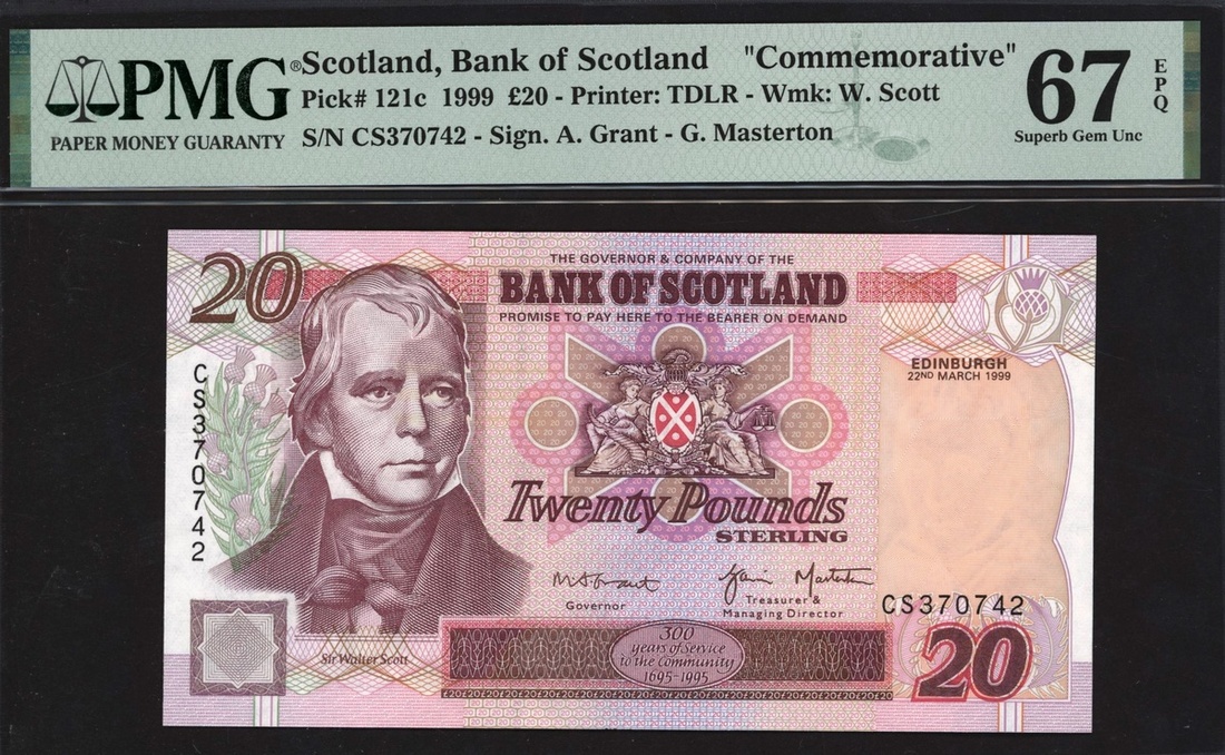(x) Bank of Scotland, [Top Pop] £20, 22 March 1999, serial number CS370742, (PMS BA124c, Pick 121c), in PMG holder 67 EPQ Superb Gem Unc