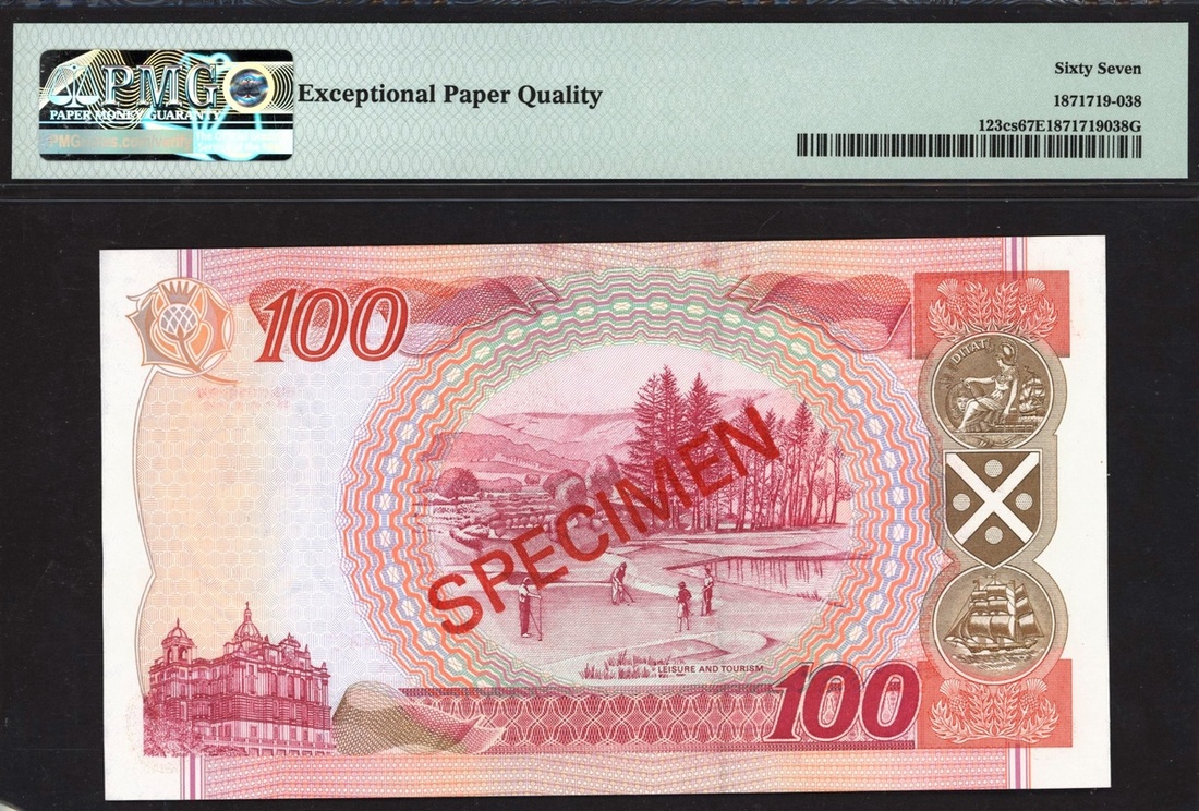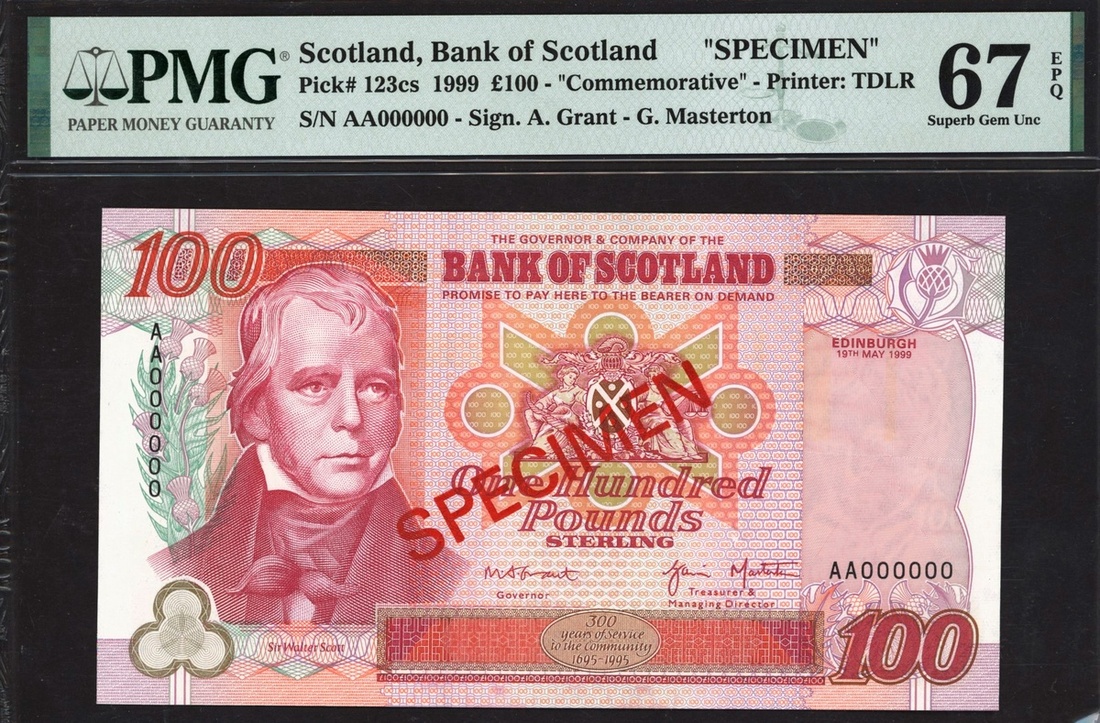 (x) Bank of Scotland, specimen £100, 19 May 1999, zero serial numbers, (PMS BA126s, Pick 123cs), in PMG holder 67 EPQ Superb Gem Unc, scarce date