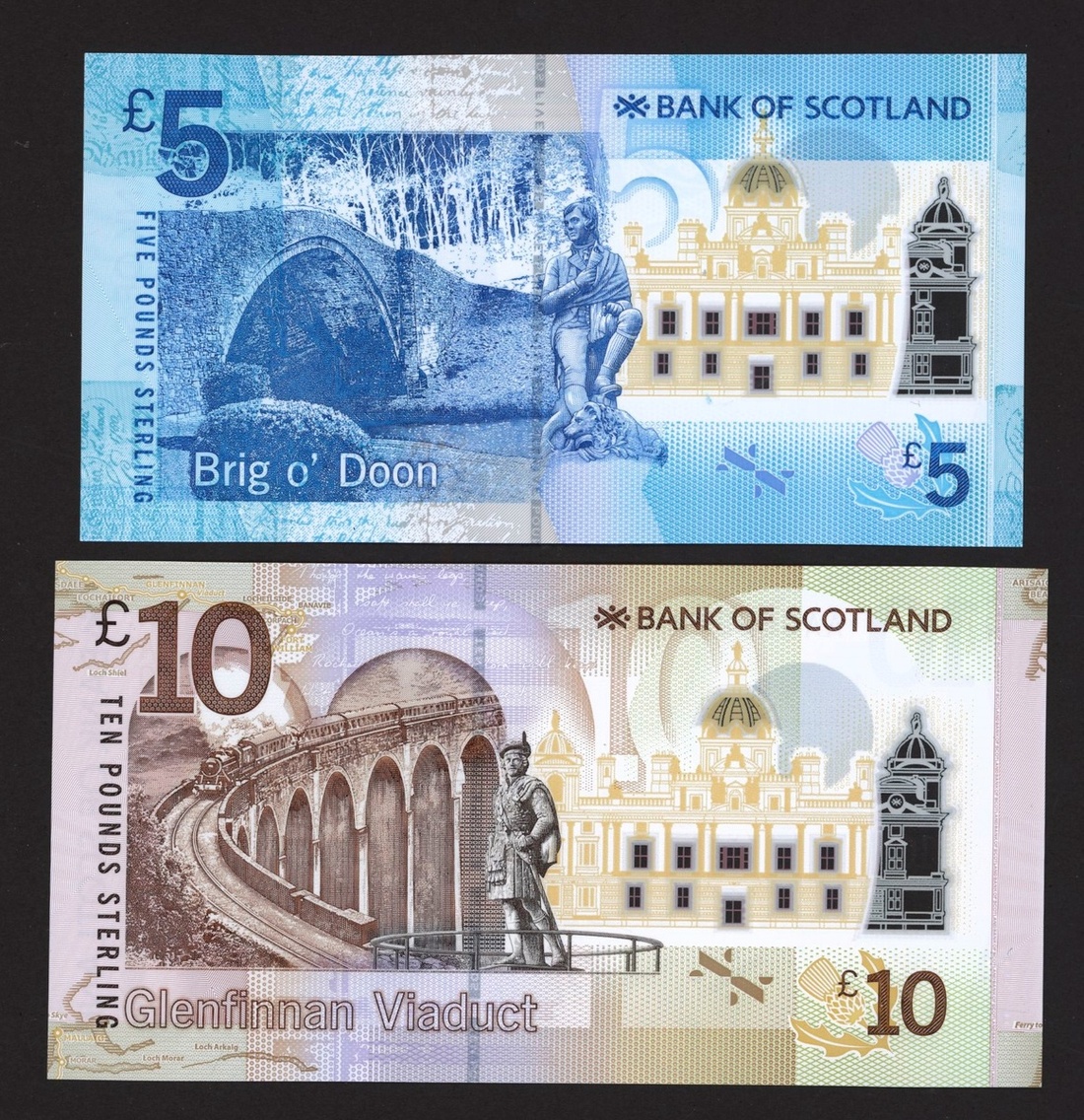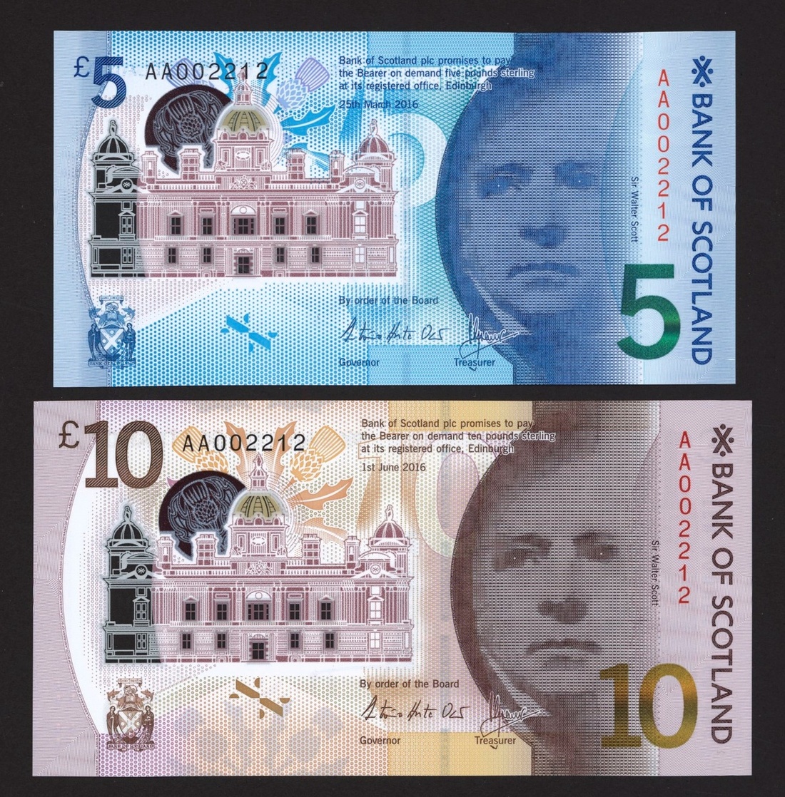 Bank of Scotland, £5, £10, 2016, matching serial numbers AA 002212, (PMS BA 133a, 134a, Pick 130, 131), uncirculated (2 notes)