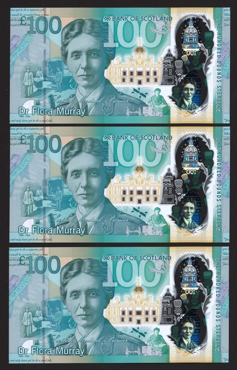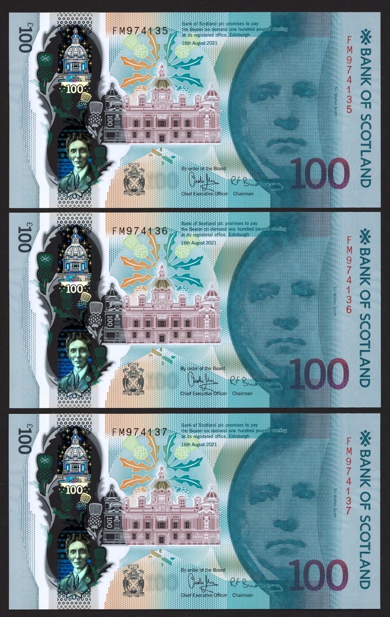 Bank of Scotland, consecutive polymer £100 (3), 2021, prefix FM, (PMS BA138), uncirculated (3 notes)