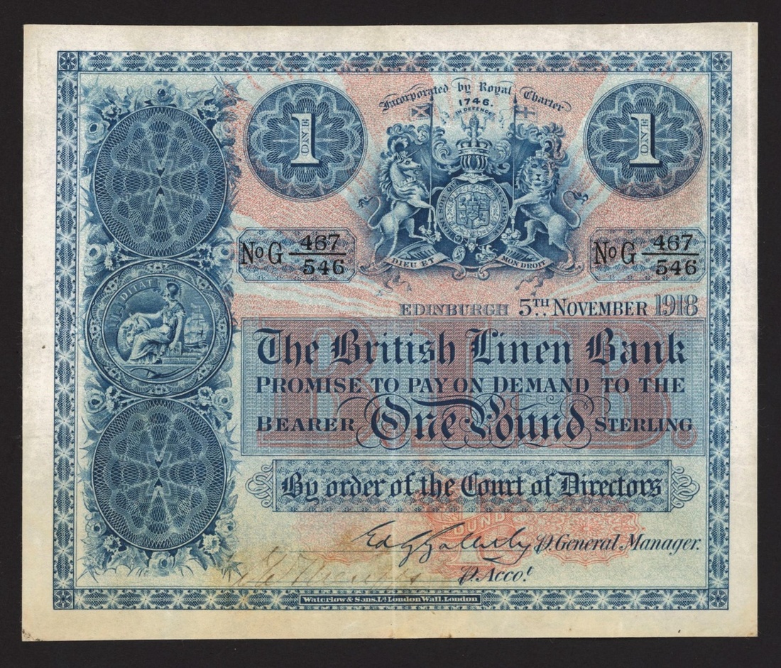 British Linen Bank, Scotland, £1, 5 November 1918, serial number G 467/546, (PMS BL59a), last date for type, pressed very fine