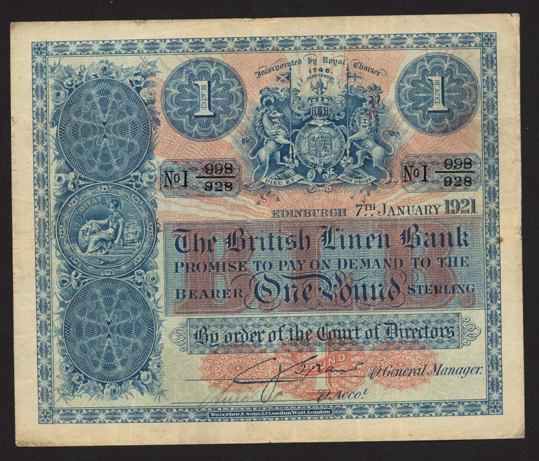 (x) British Linen Bank, Scotland, £1, 7 January 1921, serial number I 998/928, (PMS BL59b), about very fine