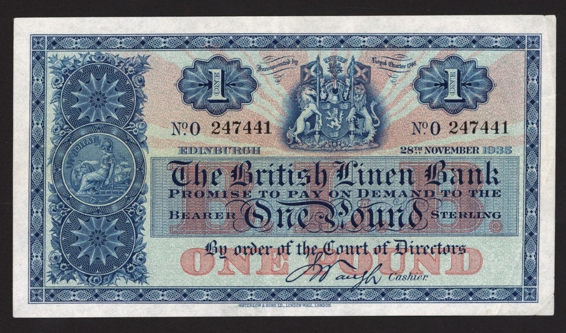 (x) British Linen Bank, Scotland, £1, 28 November 1935, serial number O 247441, (PMS BL65a), early date, pressed, extremely fine