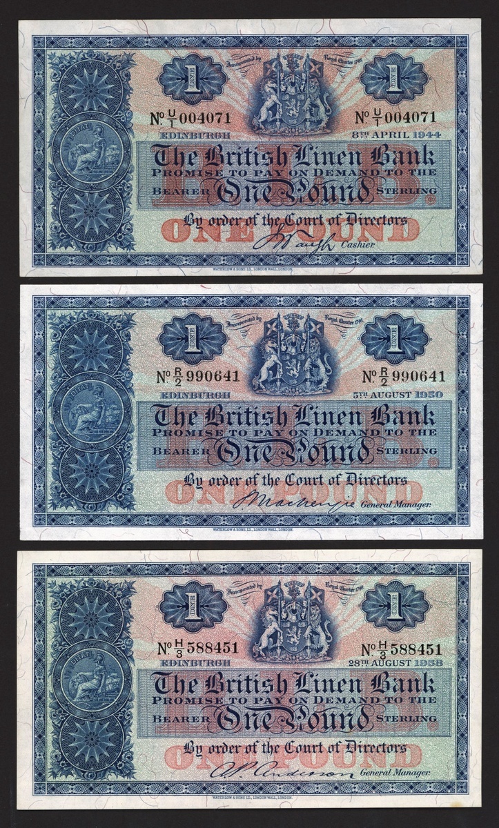 (x) British Linen Bank, Scotland, £1 (3), 1944, 1950, 1958, prefixes U/1, R/2, H/3, (PMS BL65b, c, d), all extremely fine, 1950 pressed (3 notes)