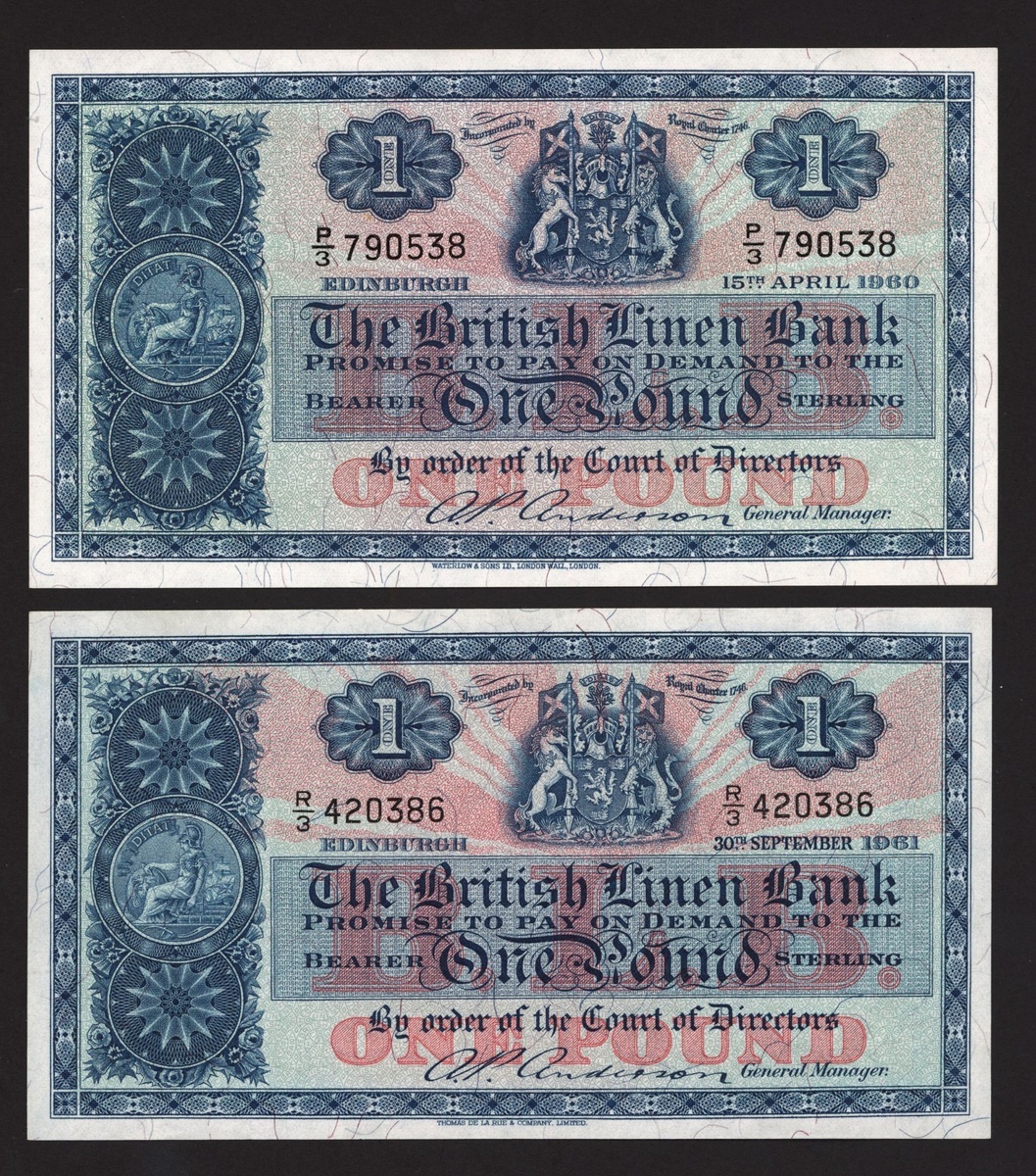 (x) British Linen Bank, Scotland, £1 (2), 1960, 1961, prefixes P/3, R/3, (PMS BL65e. 70), both about uncirculated (2 notes)