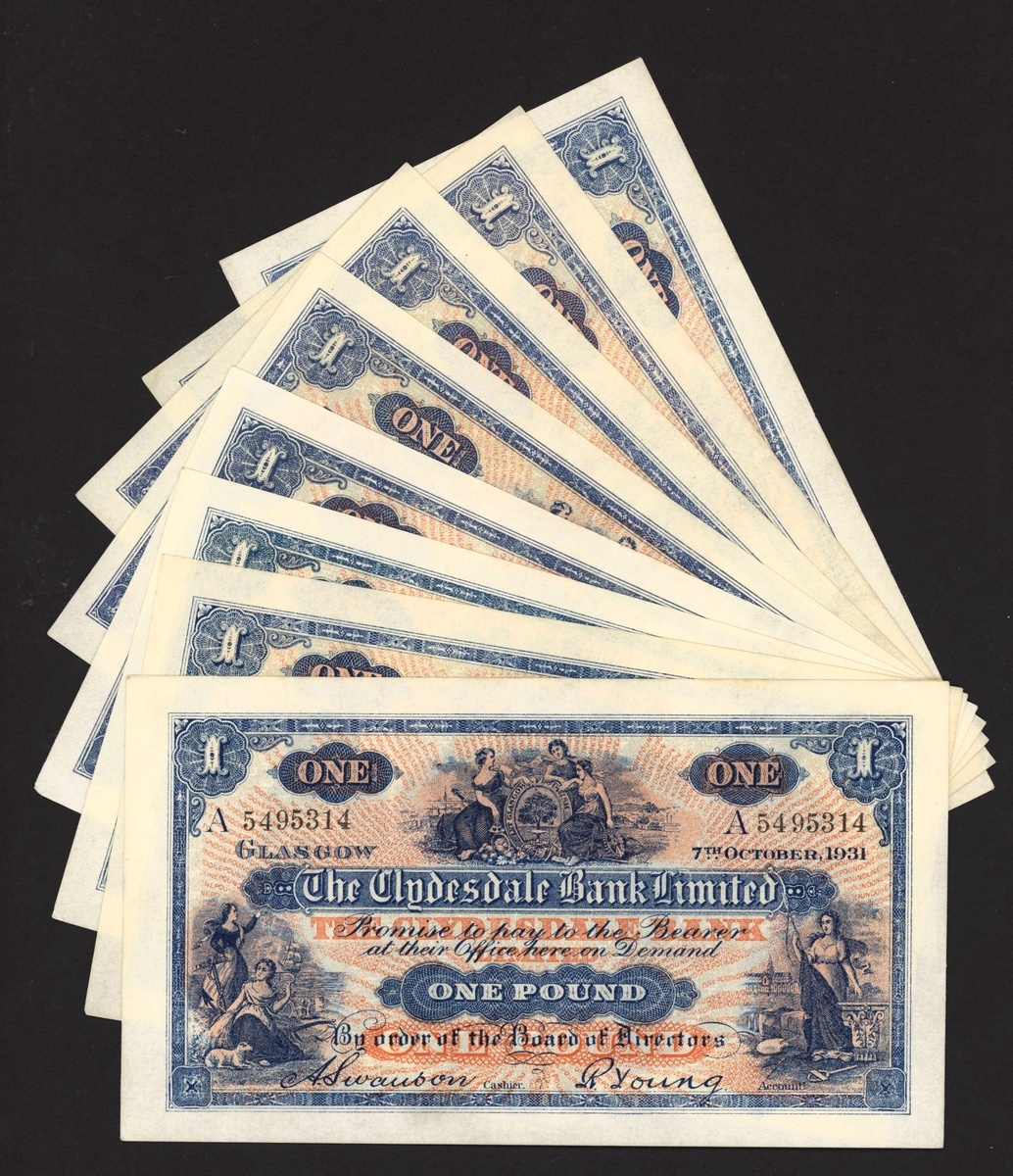 Clydesdale Bank Limited, £1 (8), 1931, 1934, 1935, 1937, 1940, 1941, 1942, 1943, (PMS CL19a, b), balance pressed extremely fine (8 notes)