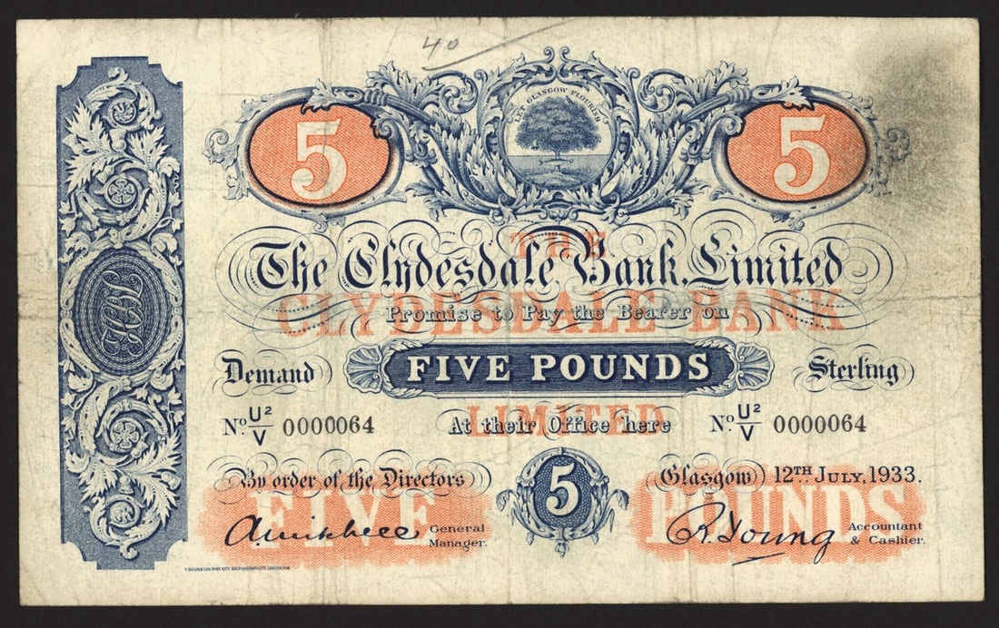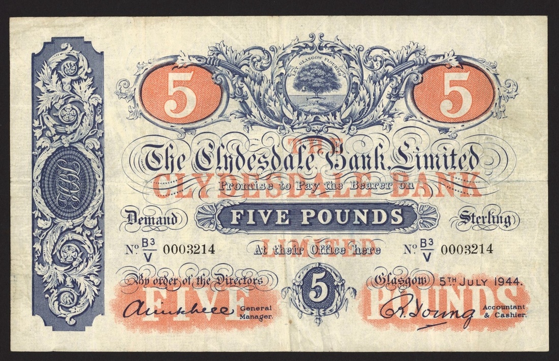 Clydesdale Bank Limited, £5 (2), 1933, 1944, prefixes U2/V, B3/V, (PMS CL20c, e), both fine (2 notes)