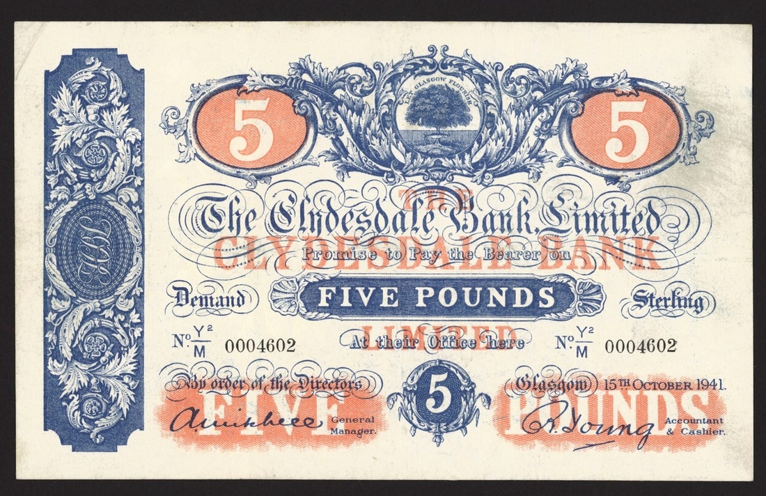 Clydesdale Bank Limited, £5, 15 October 1941, serial number Y2/M 0004602, (PMS CL20d), last year for type, pressed very fine