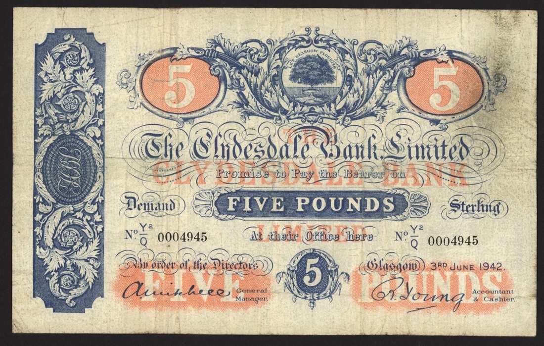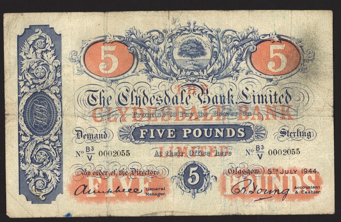 Clydesdale Bank Limited, £5 (2), 1942, 1944, prefixes Y2/Q, B3/V, (PMS CL20e), first and last date, both fine (2 notes)