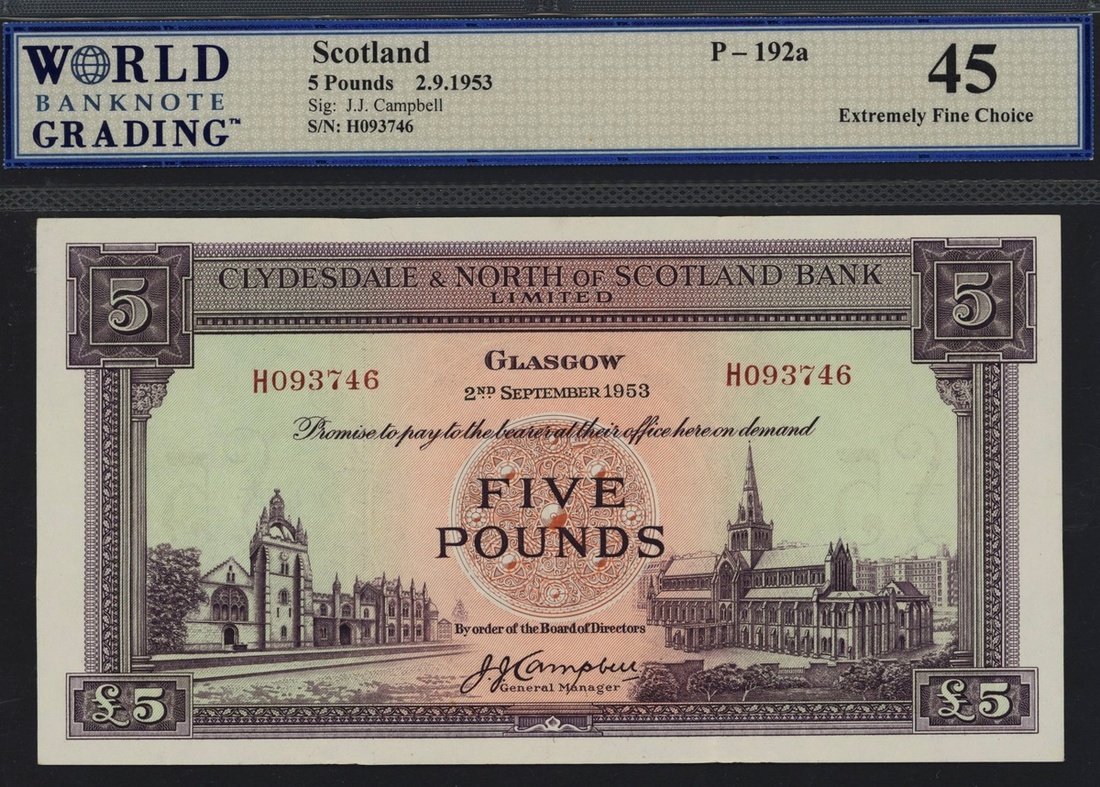 (x) Clydesdale & North of Scotland Bank Limited, £5, 2 September 1953, serial number H093746, (PMS CL25a, Pick 192a), in WBG holder 45 Extremely Fine Choice