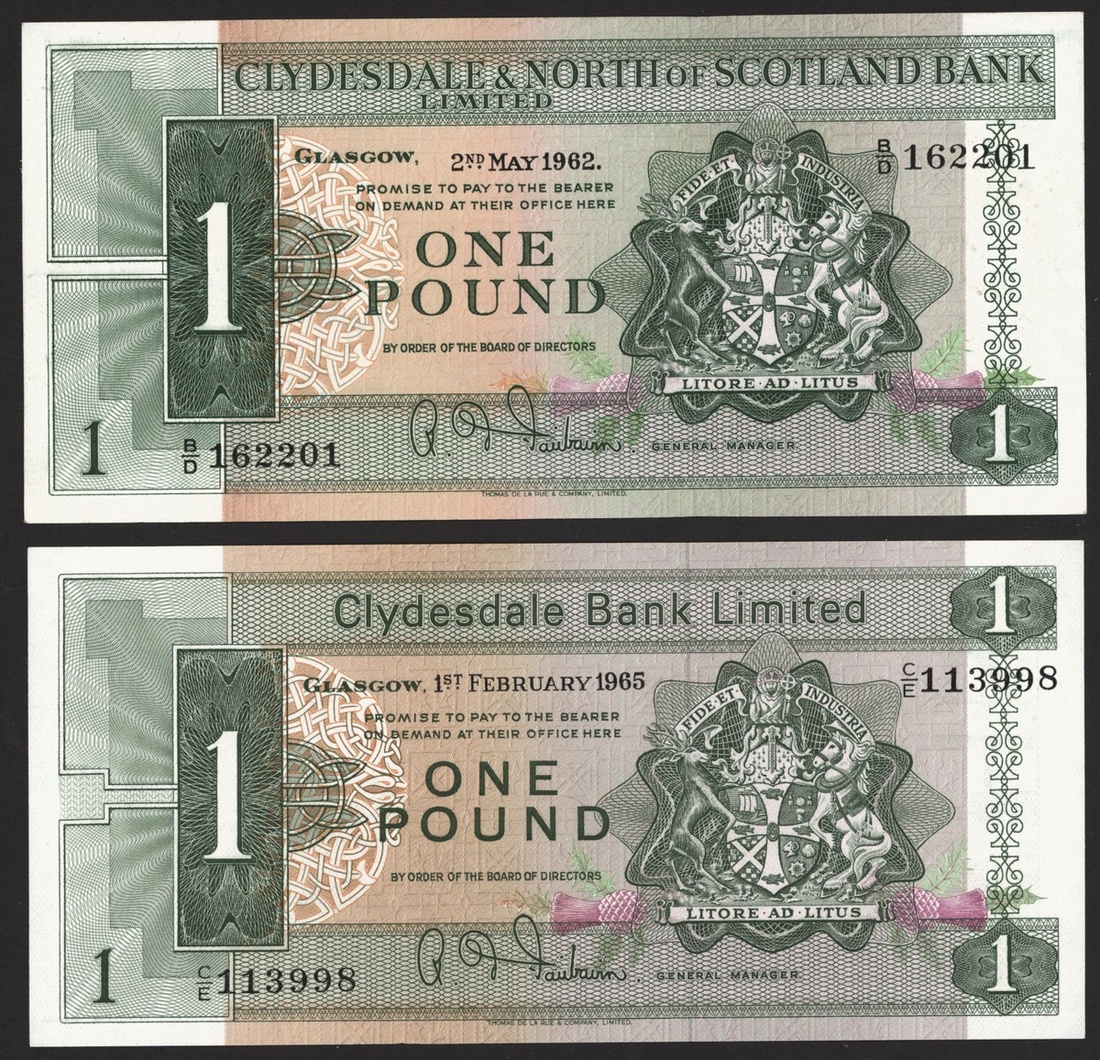 (x) Clydesdale & North of Scotland Bank Limited, £1, 2 May 1962, serial number B/D 162201, also a Clydesdale £1 1965, prefix C/E,