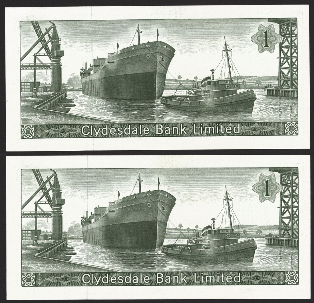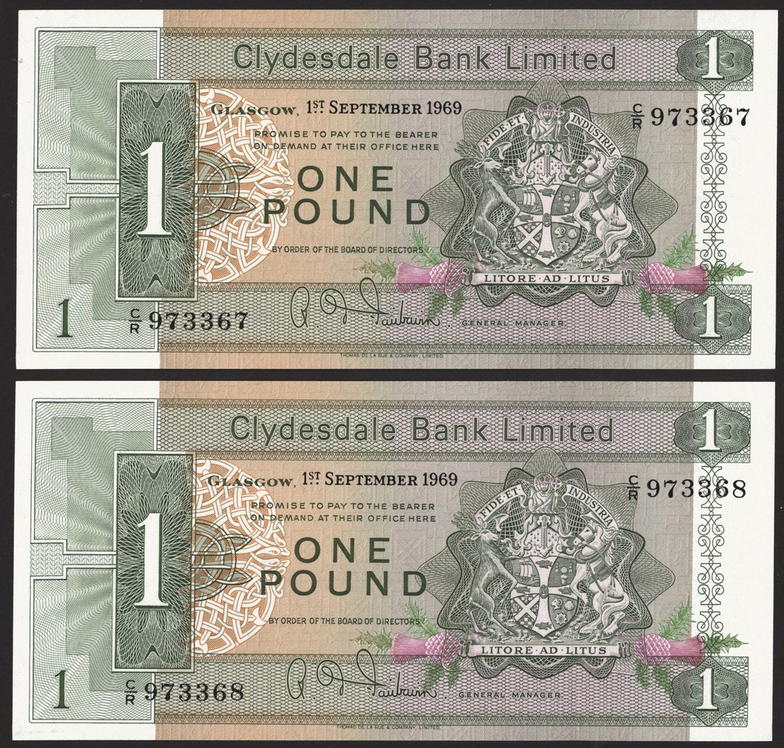 (x) Clydesdale Bank Limited, consecutive pair £1 (2), 1 September 1969, serial number C/R 973367/68 (PMS CL30b), uncirculated (2 notes)