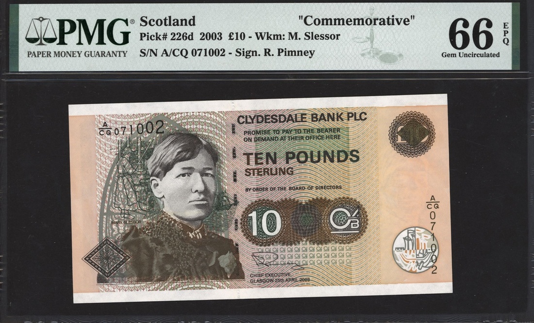 Clydesdale Bank Plc, £10, 25 April 2003, serial number A/CQ 071002, (PMS CL51e, Pick 226d), in PMG holder 66 EPQ Gem Uncirculated